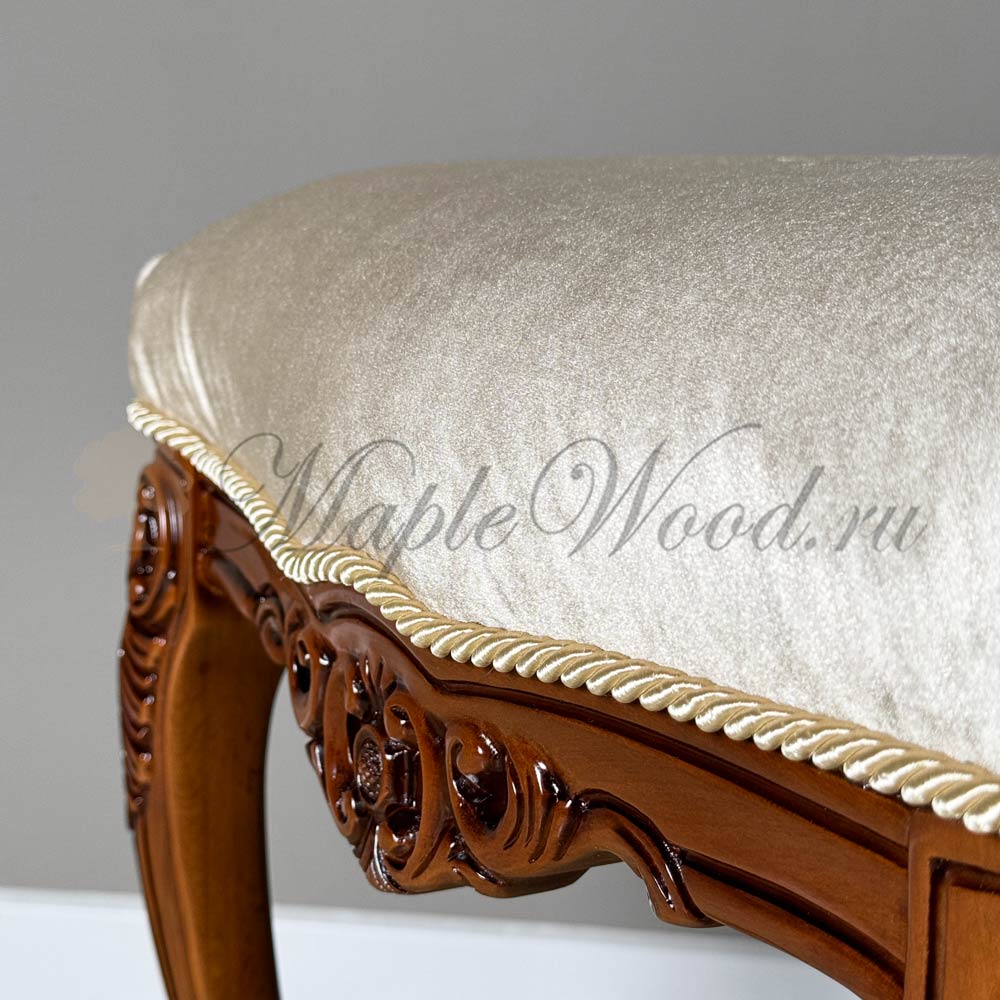 Каркас изделия выполнен из массива дерева и декорирован резными элементами, которые подчеркивает классический дизайн изделия, а в качестве обивочного материала использован бежевый велюр с вышивкой.