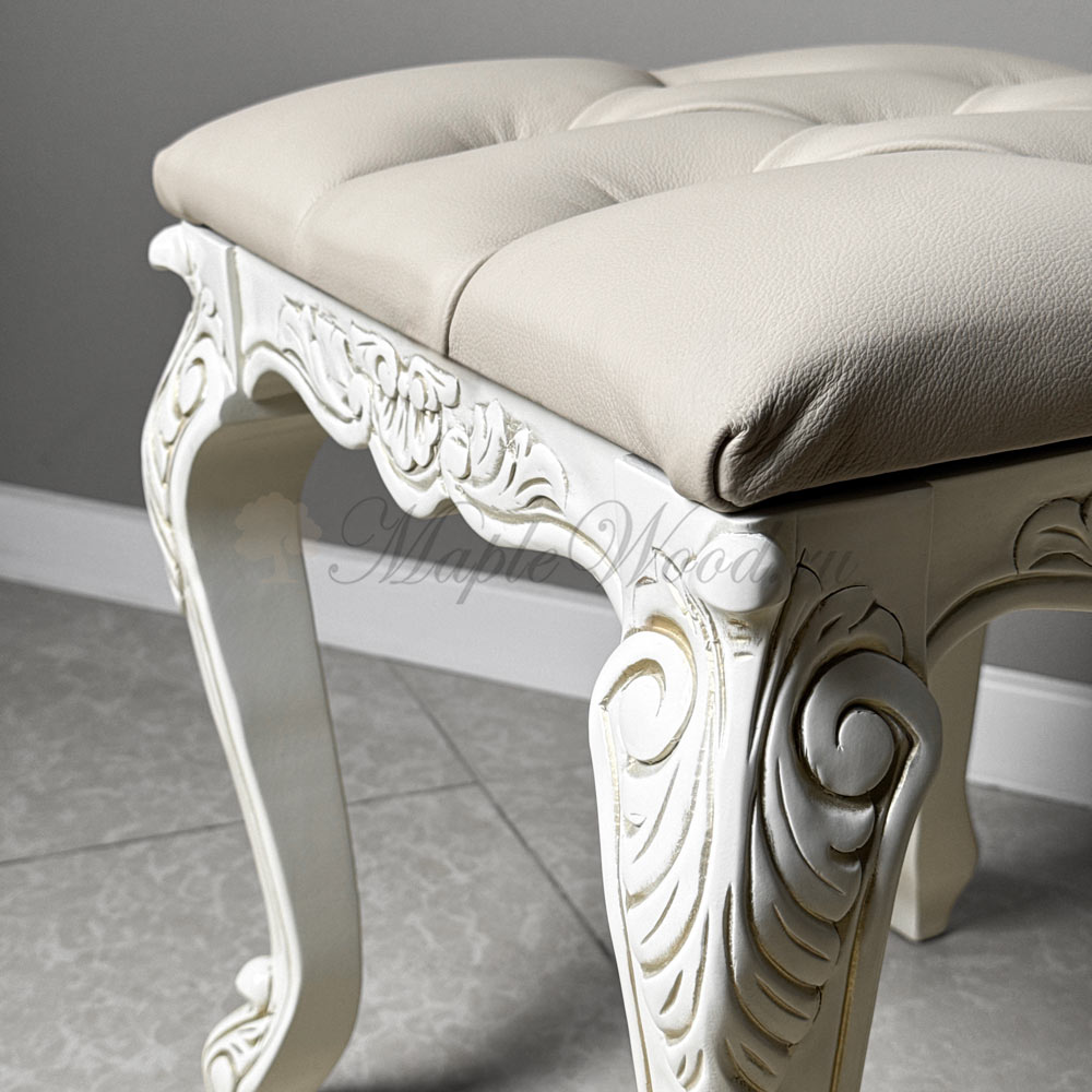 Резной каркас из массива дерева представлен в светлом оттенке и декорирован золотой патиной, что придаёт модели благородство и лёгкое сияние.