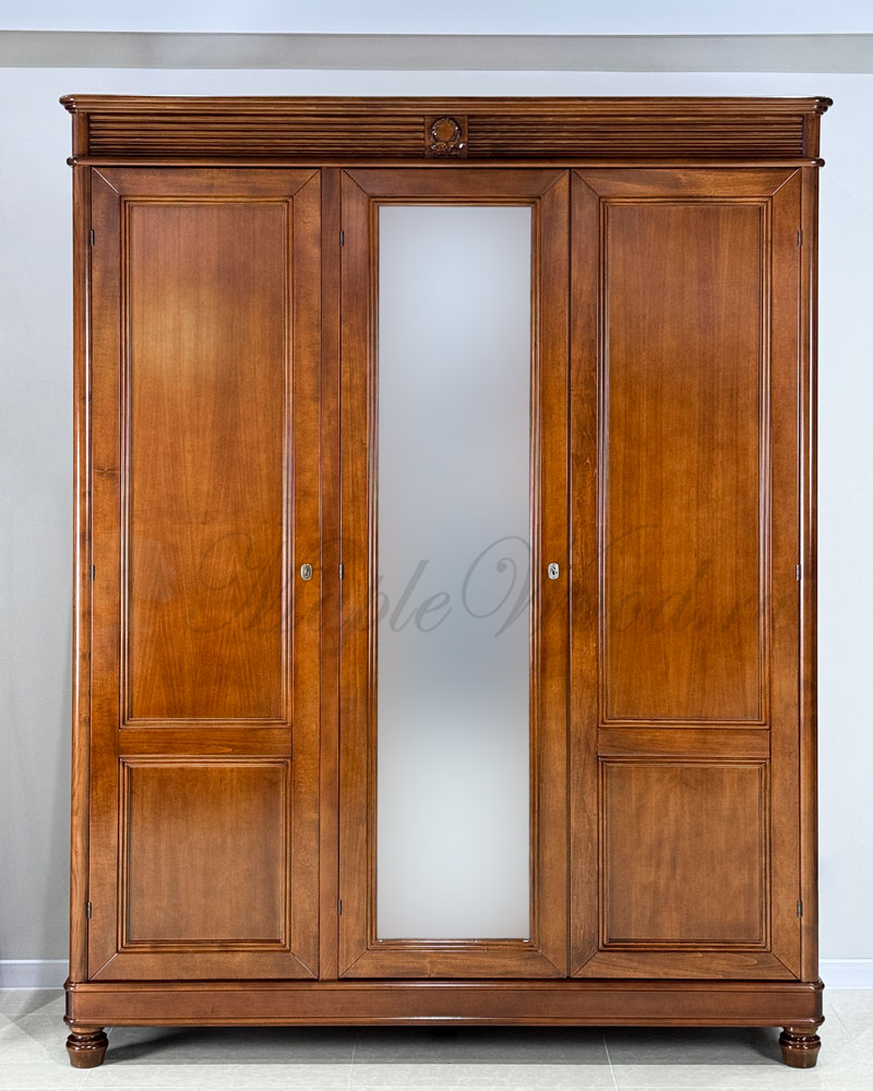Распашной 3-х дверный шкаф с зеркальной вставкой из коллекции Мария Сильва от фабрики Monte Cristo Mobili выполнен в итальянском стиле из массива дерева и может быть исполнен как в стандартной цветовой отделке орех, так и в других цветовых решениях из каталога производителя.