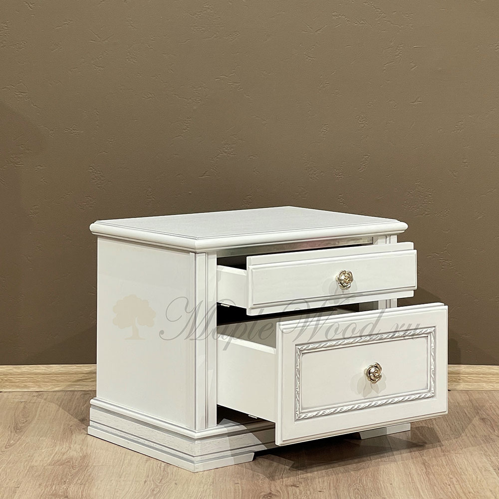 Прикроватная тумба из коллекции Палермо от фабрики Timber оборудована двумя выдвижными ящиками, которые оснащены системой плавного закрывания.