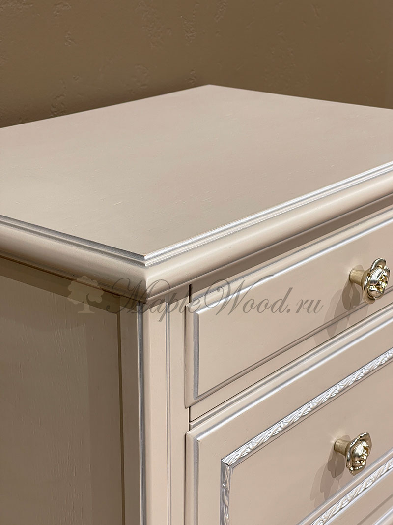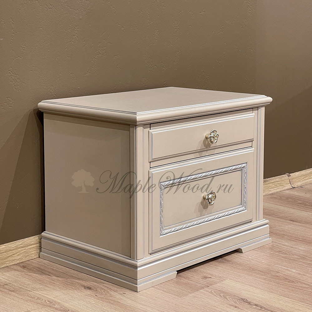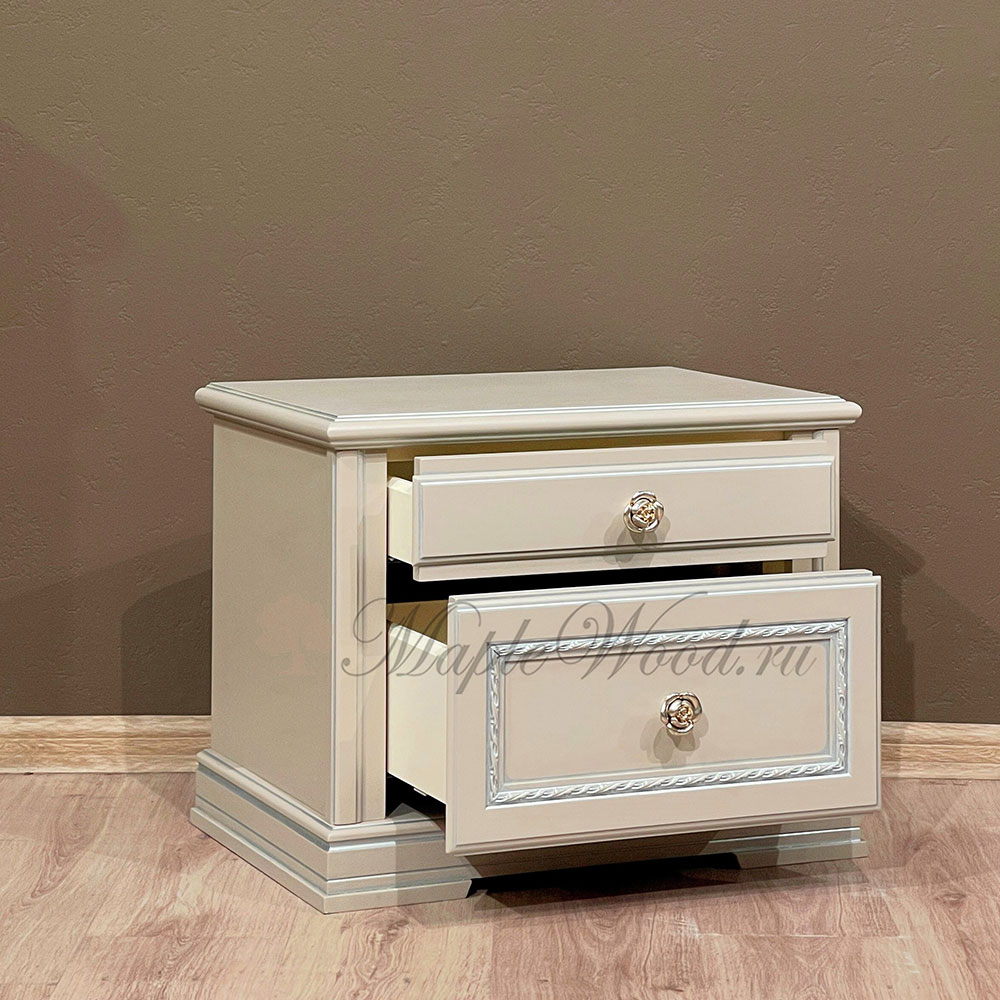 Прикроватная тумба в кремовом оттенке из коллекции Палермо от фабрики Timber оборудована двумя выдвижными ящиками, которые оснащены системой плавного закрывания.