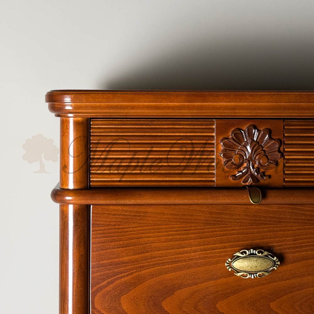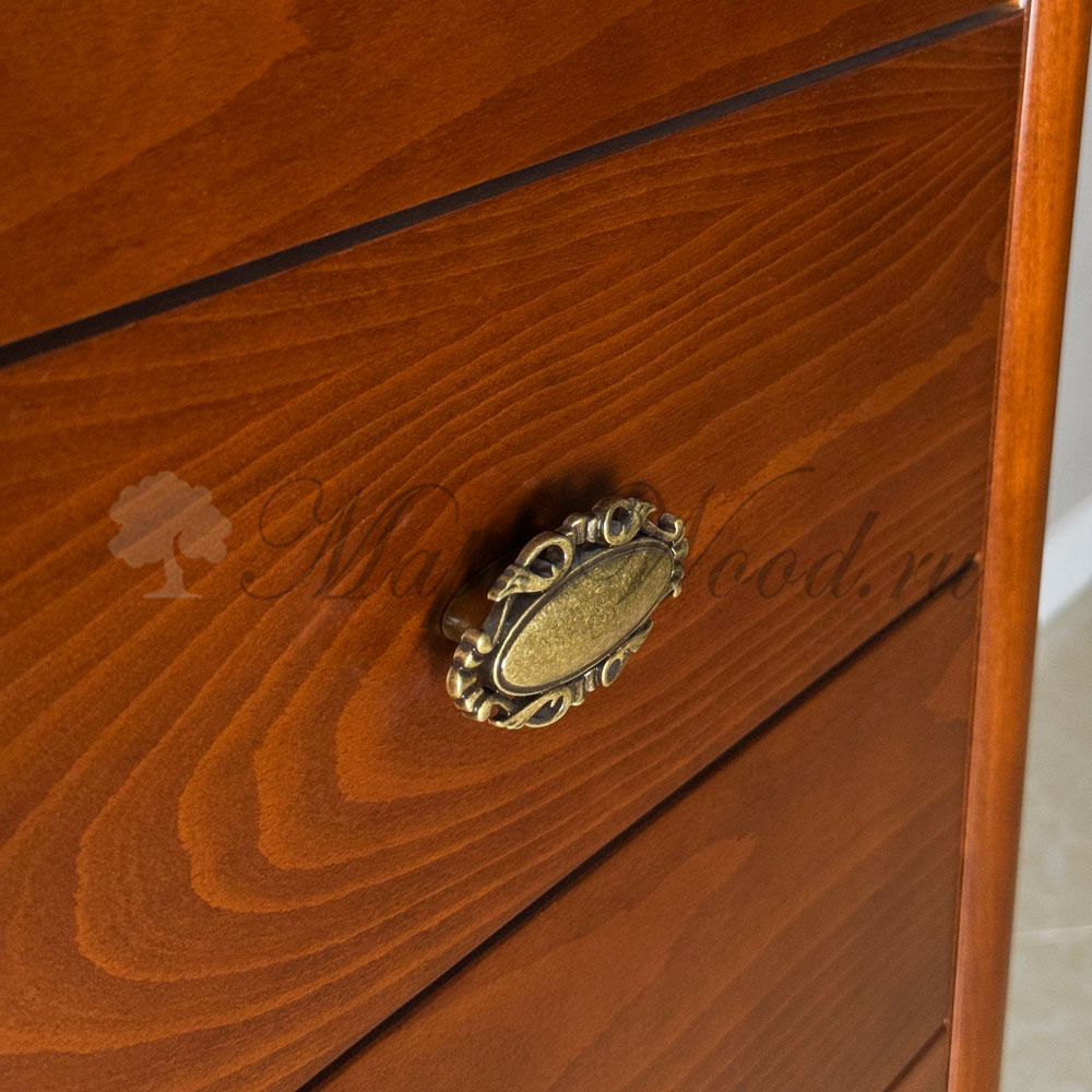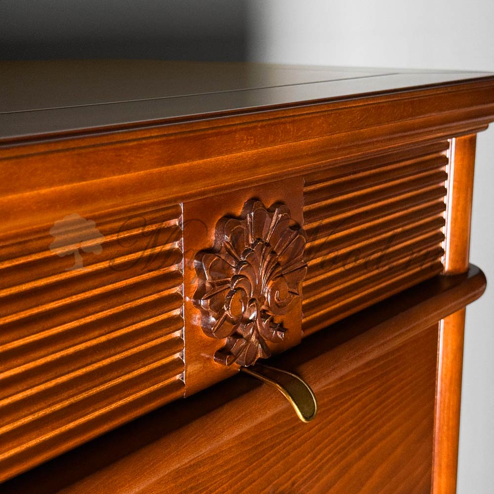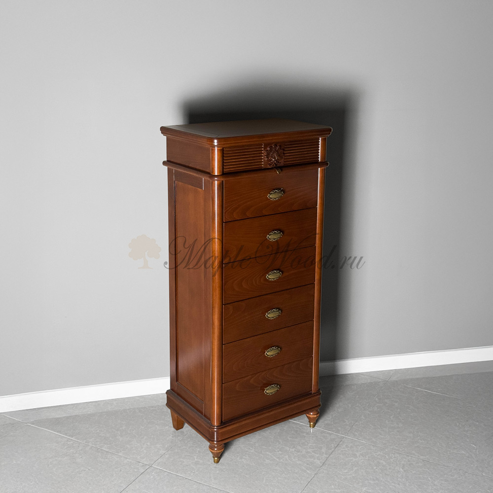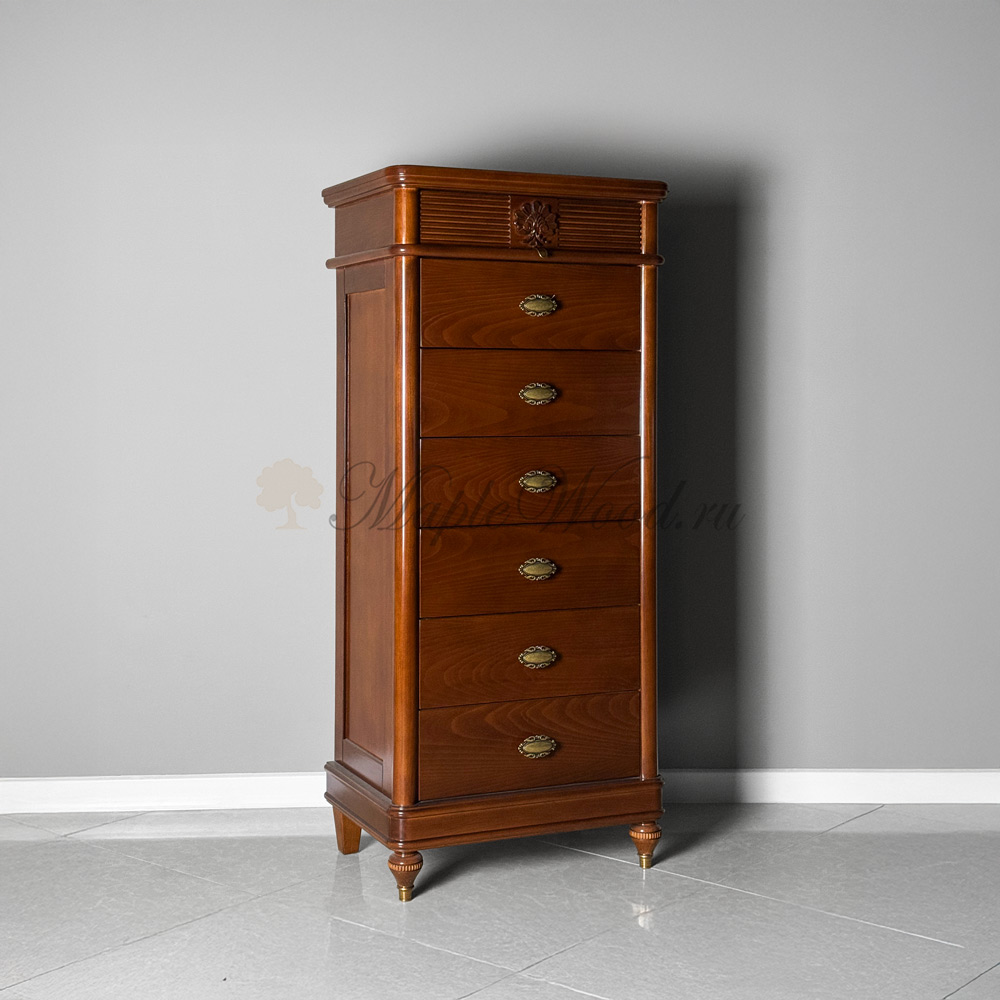 Высокий комод с семью выдвижными ящиками из коллекции Бурбон от фабрики Monte Cristo Mobili выполнен в итальянском стиле из натурального дерева в отделке орех и декорирован фирменной эмблемой и акцентной фрезеровкой, которая завершает дизайн изделия.