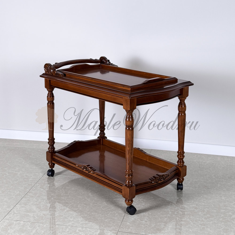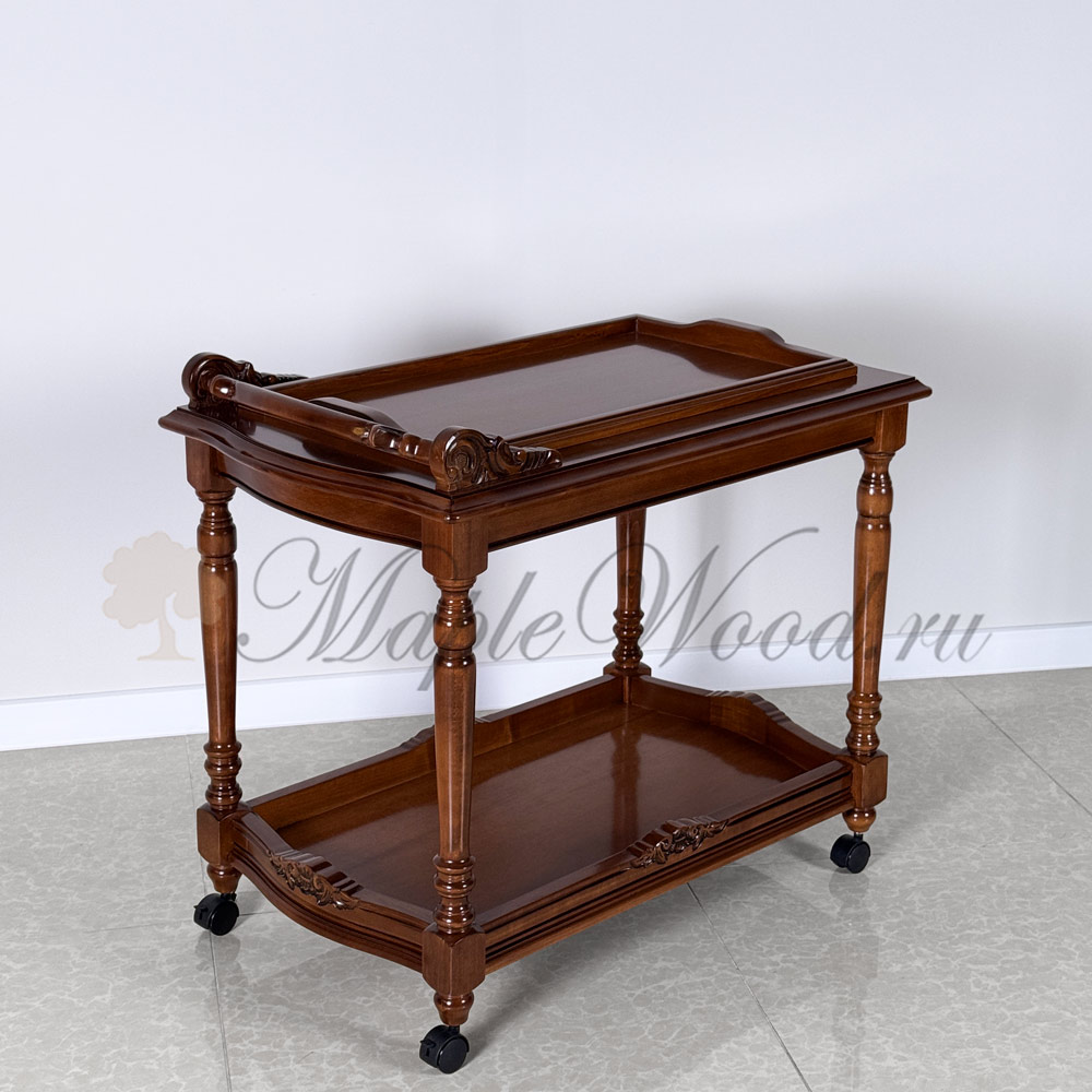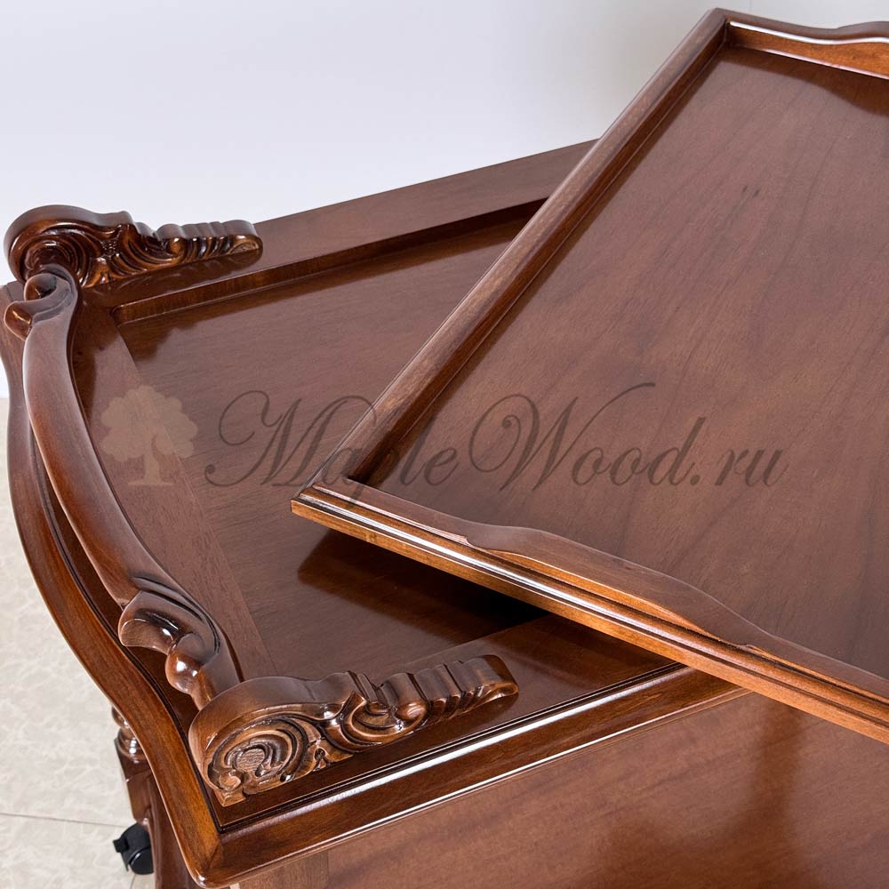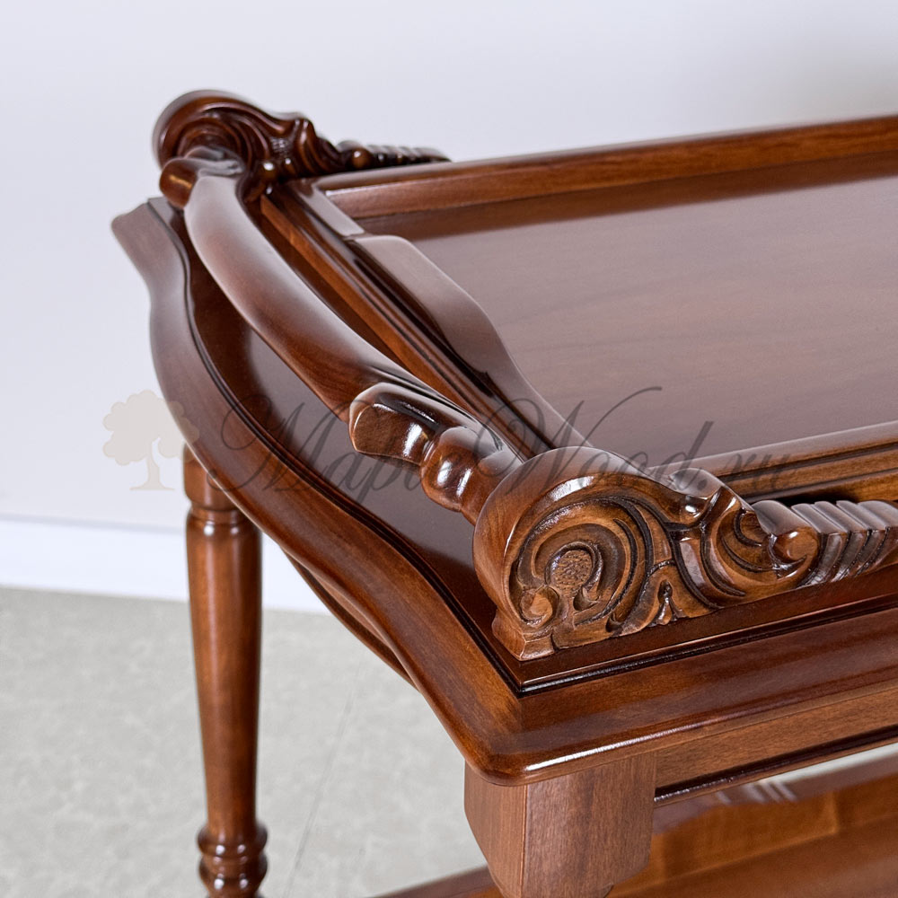 Сервировочный столик из коллекции Кристина от фабрики Simex выполнен в классическом стиле из натурального массива дерева и украшен резьбой, которую румынские мастера выполняют вручную.