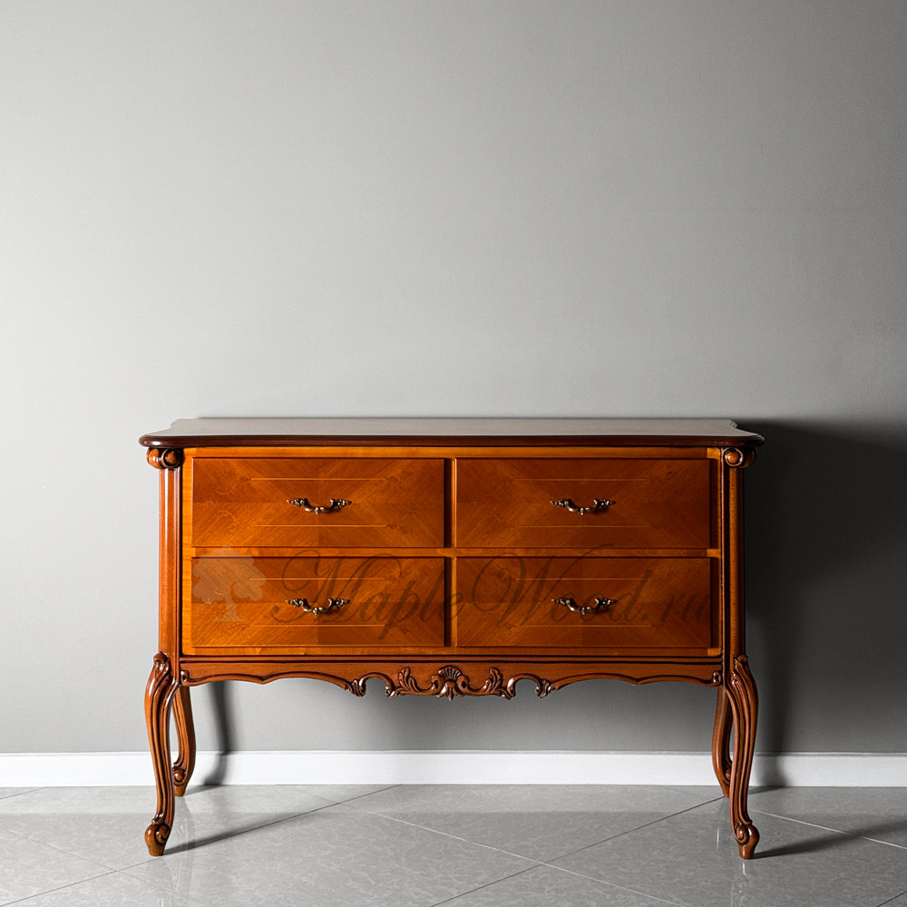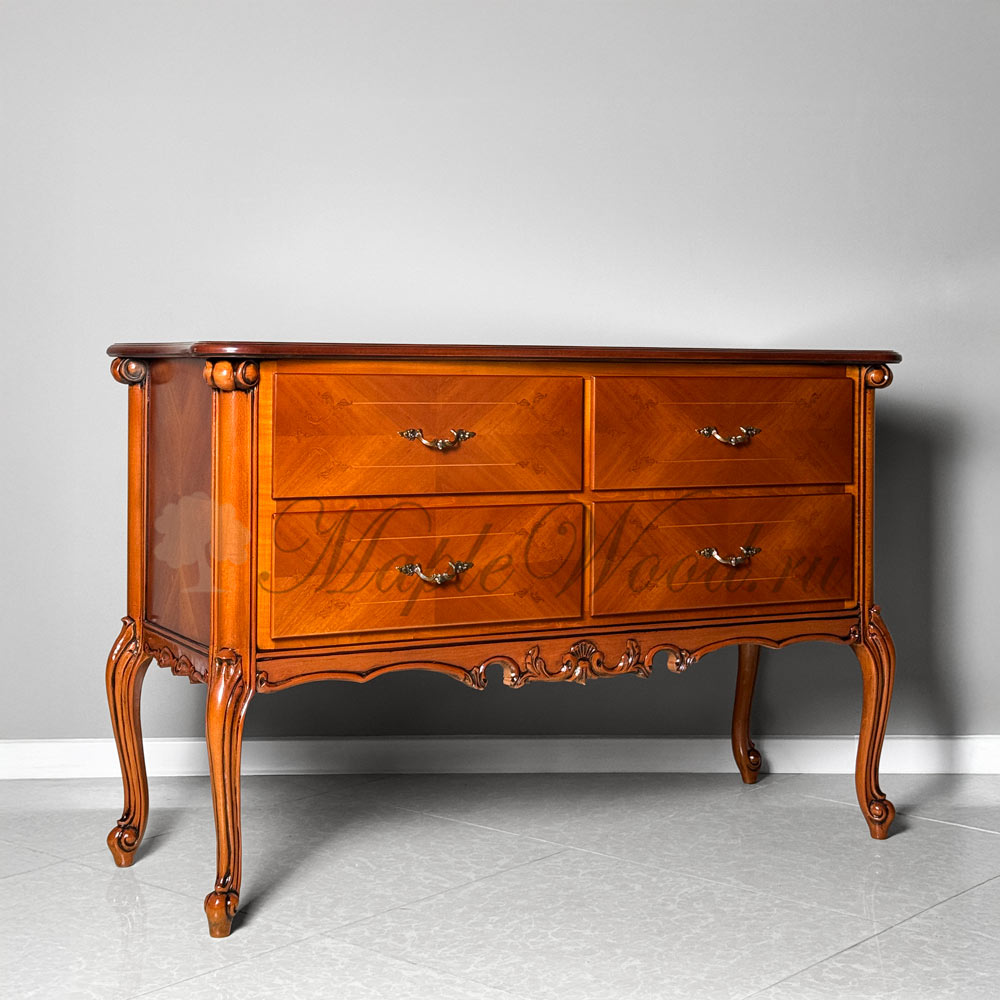 Комод выполнен из массива дерева в оттенке «орех» и оборудован четырьмя вместительными ящиками.