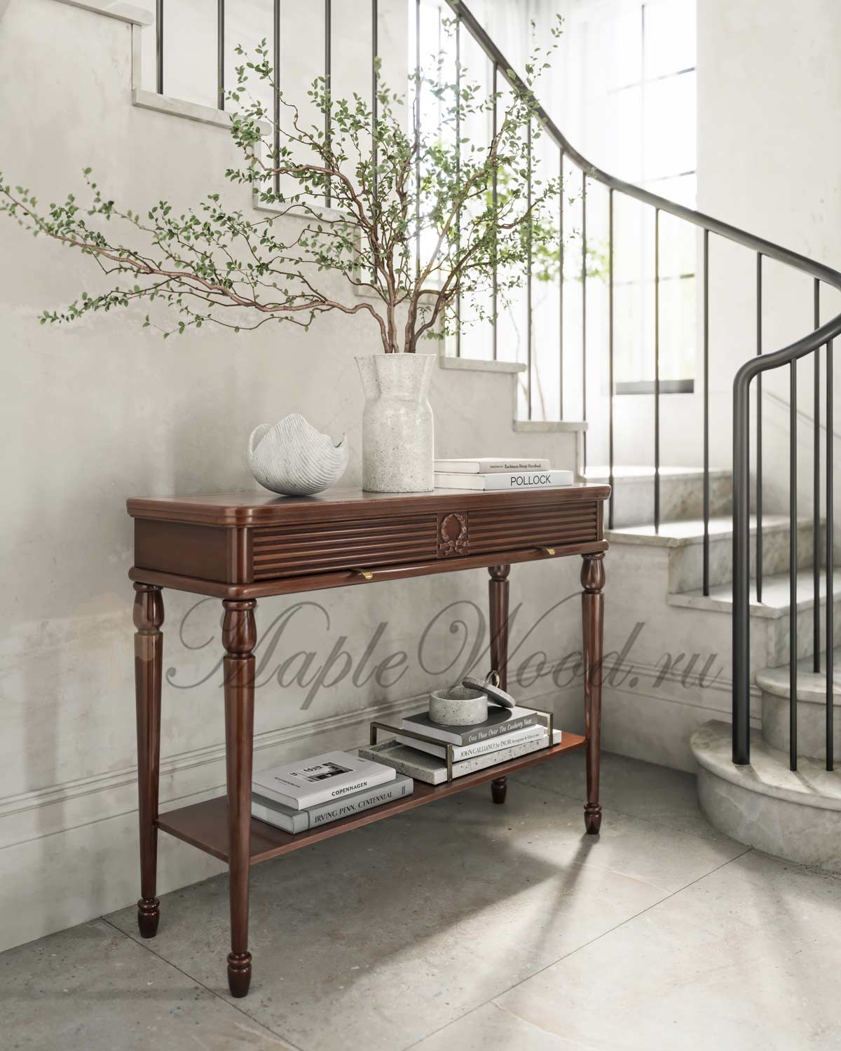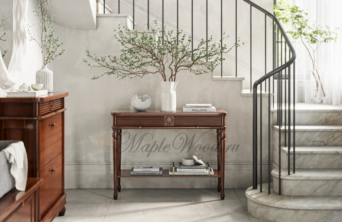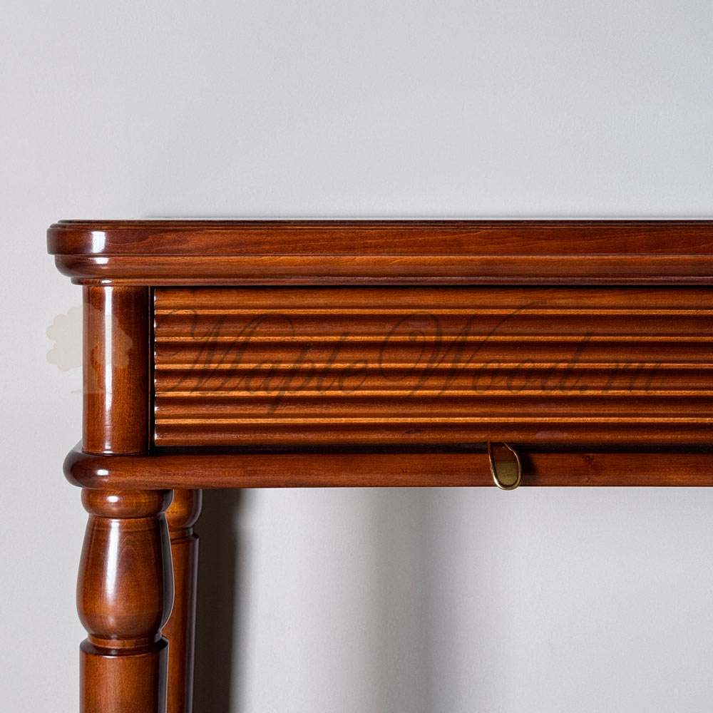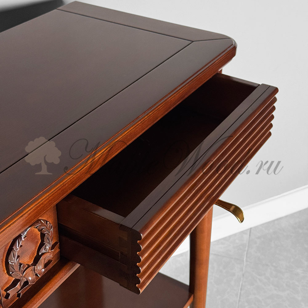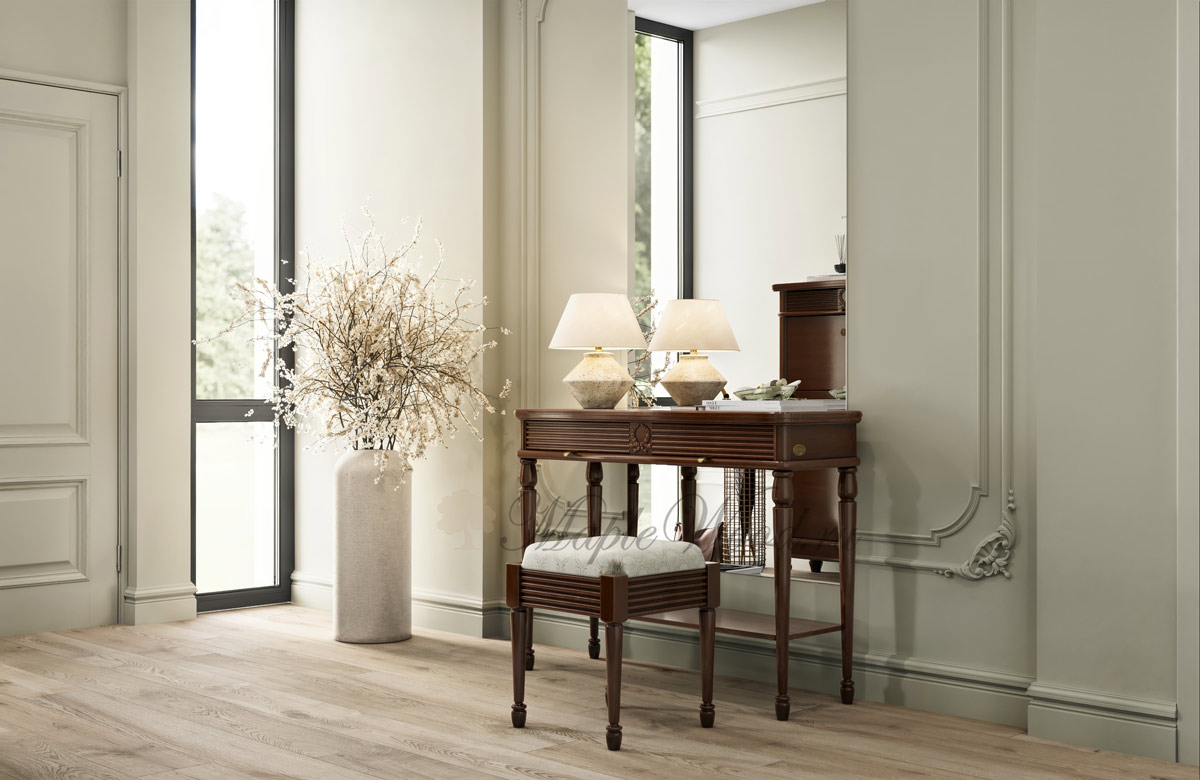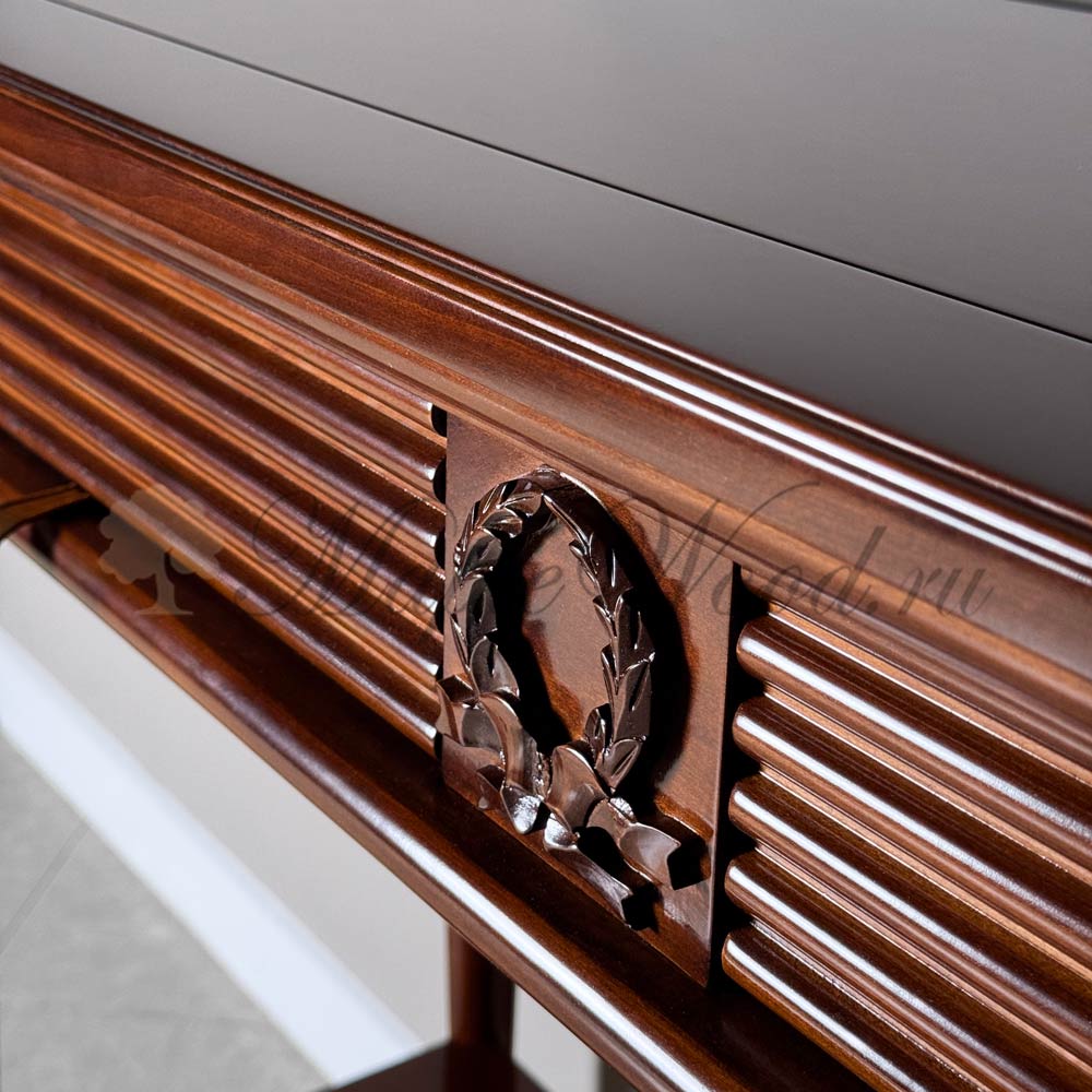 Консоль выполнена в итальянском стиле из натурального массива дерева и может быть исполнена как в стандартной отделке орех, так и в других цветовых решениях из каталога фабрики.