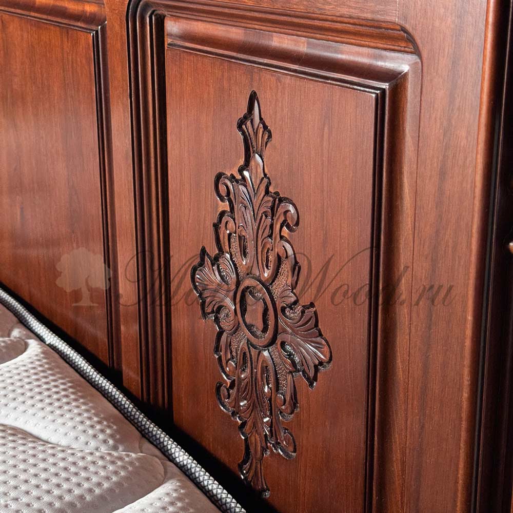 Кровать с прямоугольным изголовьем из коллекции Венеция Люкс от фабрики Simex выполнена из массива дерева в отделке орех с красным оттенком и украшена резными элементами и декоративными пилястрами, которые подчеркивают классический дизайн изделий.