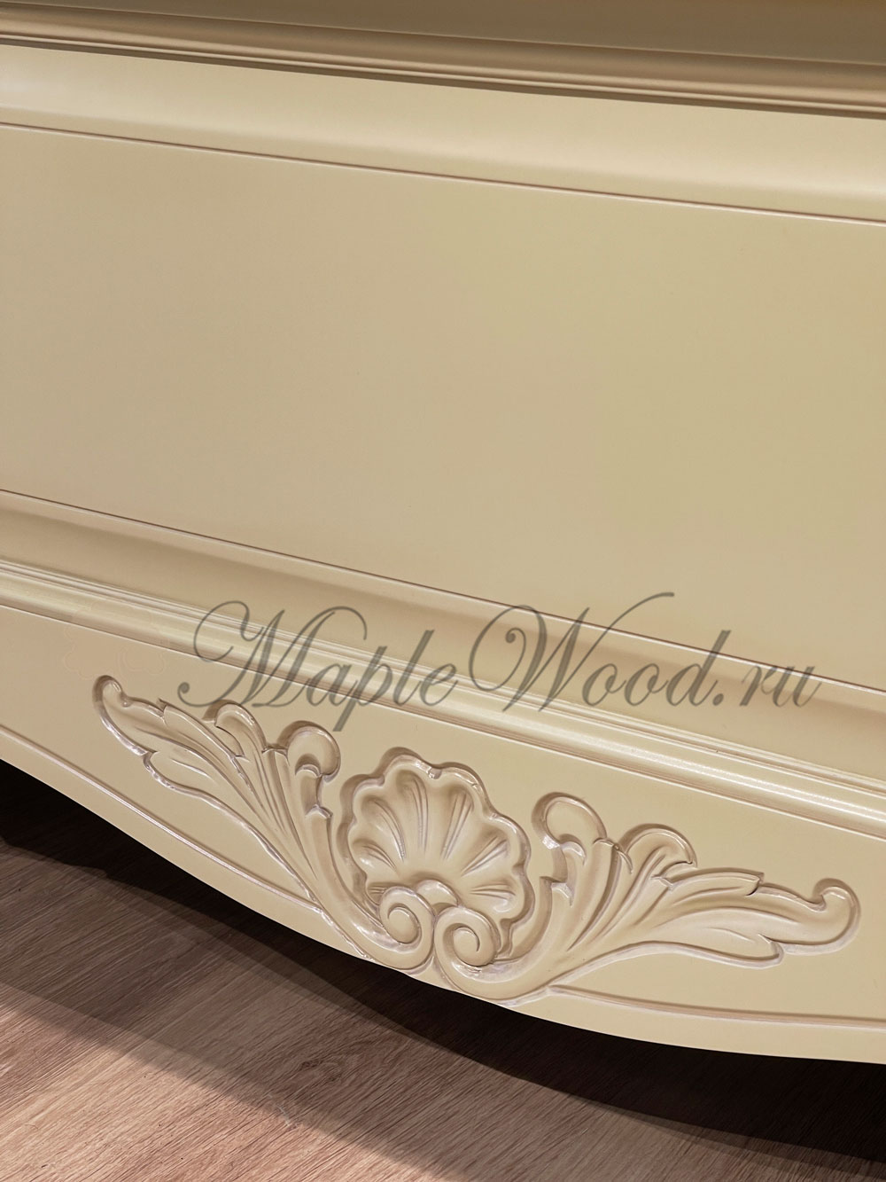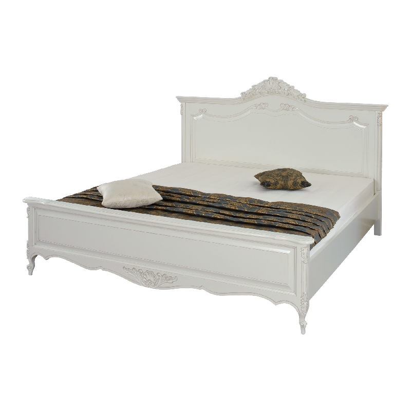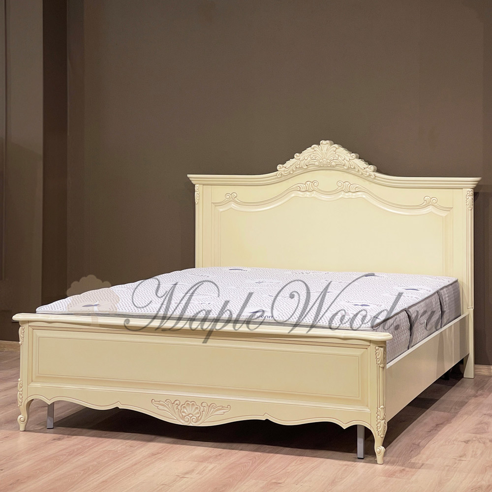 Двуспальная кровать из коллекции Могадор от фабрики Mobex выполнена в классическом стиле из массива дерева в светлом оттенке и декорирована контрастной патиной, которая подчеркивает резные элементы изделия.