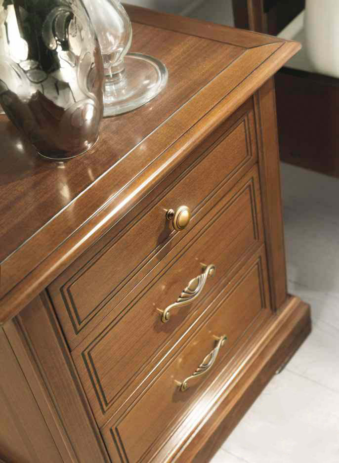 Прикроватная тумба Стелла от фабрики Монте Кристо Мобили | Monte Cristo Mobili выполнена из натурального массива дерева и оборудована тремя выдвижными ящиками, которые обеспечат удобное и организованное хранение, помогая поддерживать порядок в спальне.