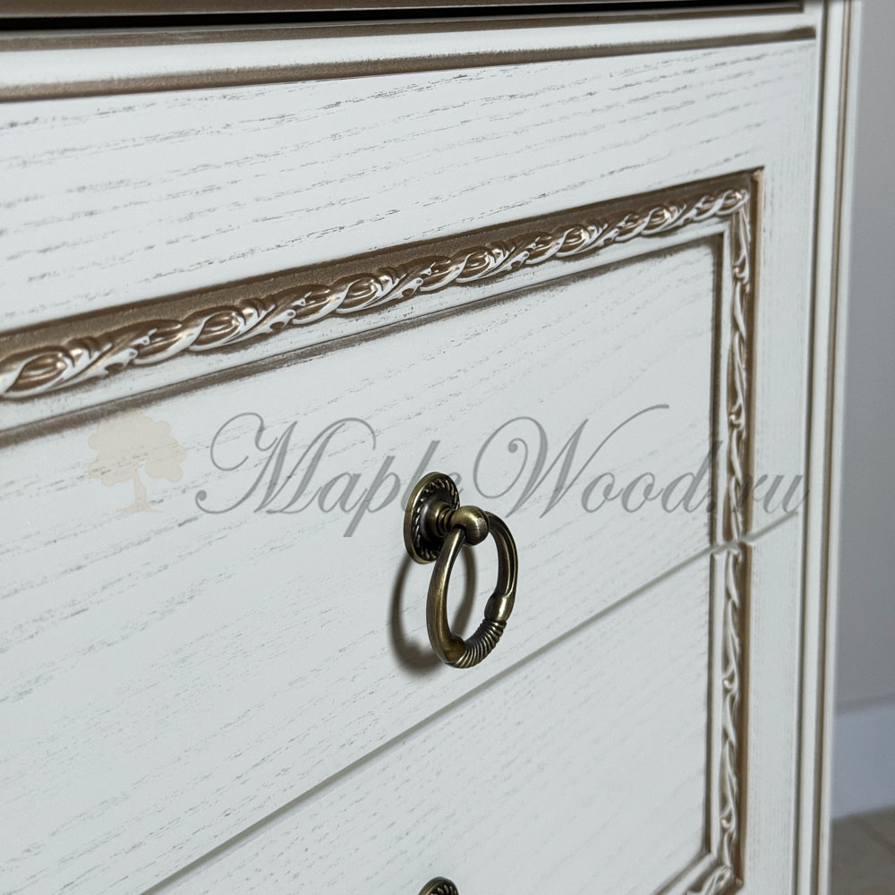 Тумба выполнена в нежном оттенке айвори из шпонированного МДФ с элементами из массива дерева и декорирована золотой патиной, которая подчеркивает акцентные детали изделия.