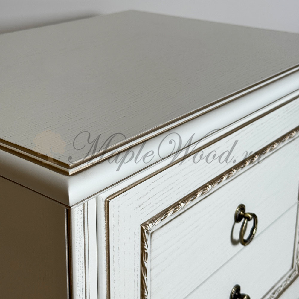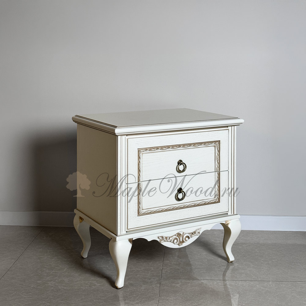 Прикроватная тумба из коллекции Неаполь от фабрики Тимбер - классическая модель на фигурных ножках, оборудованная двумя выдвижными ящиками, которые оснащены системой плавного закрывания.