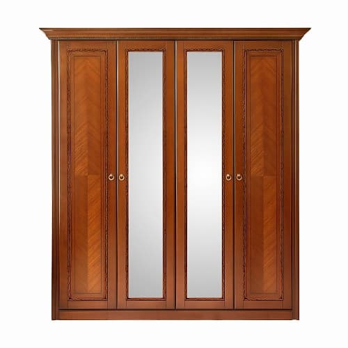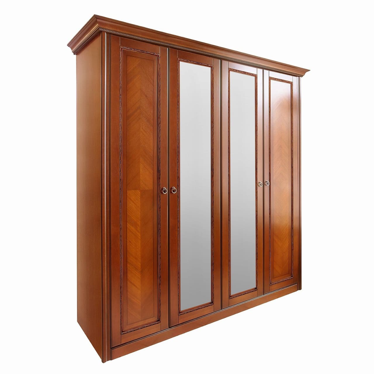 Распашной 4-х дверный шкаф с зеркальными дверями из коллекции Палермо от фабрики Тимбер выполнен в классическом стиле из шпонированного МДФ с элементами из массива дерева и декорирован контрастной патиной, которая подчеркивает акцентные детали изделия.