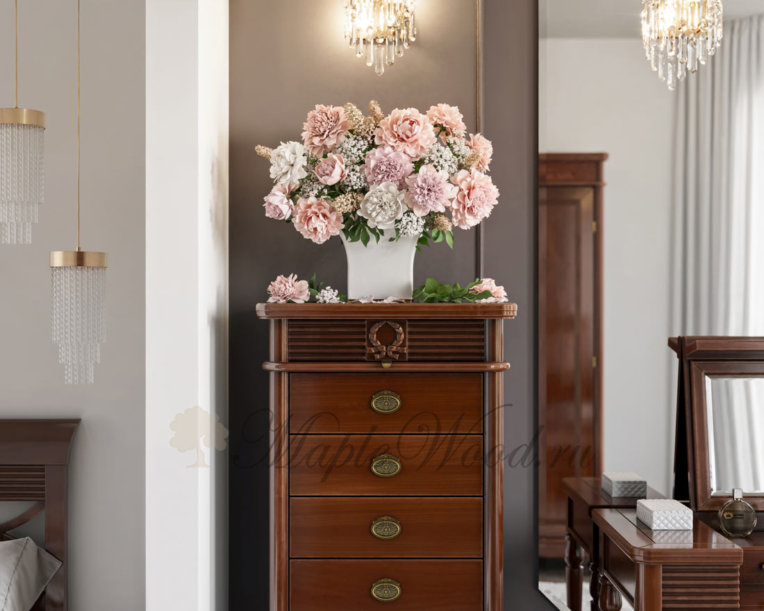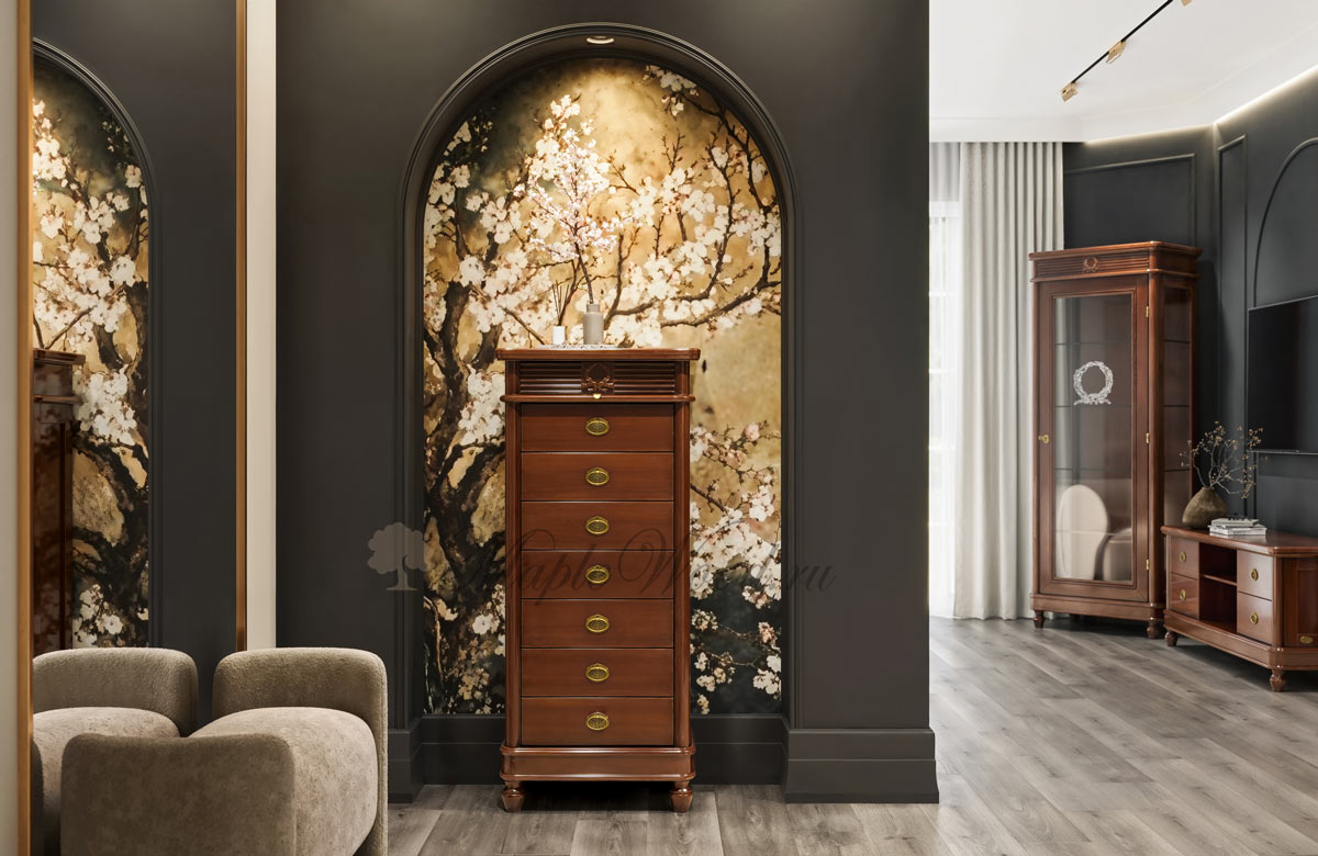 Высокий комод из коллекции Мария Сильва от фабрики Monte Cristo Mobili выполнен в итальянском стиле из натурального массива дерева и декорирован фирменной эмблемой и акцентной фрезеровкой, которая завершает дизайн изделия.