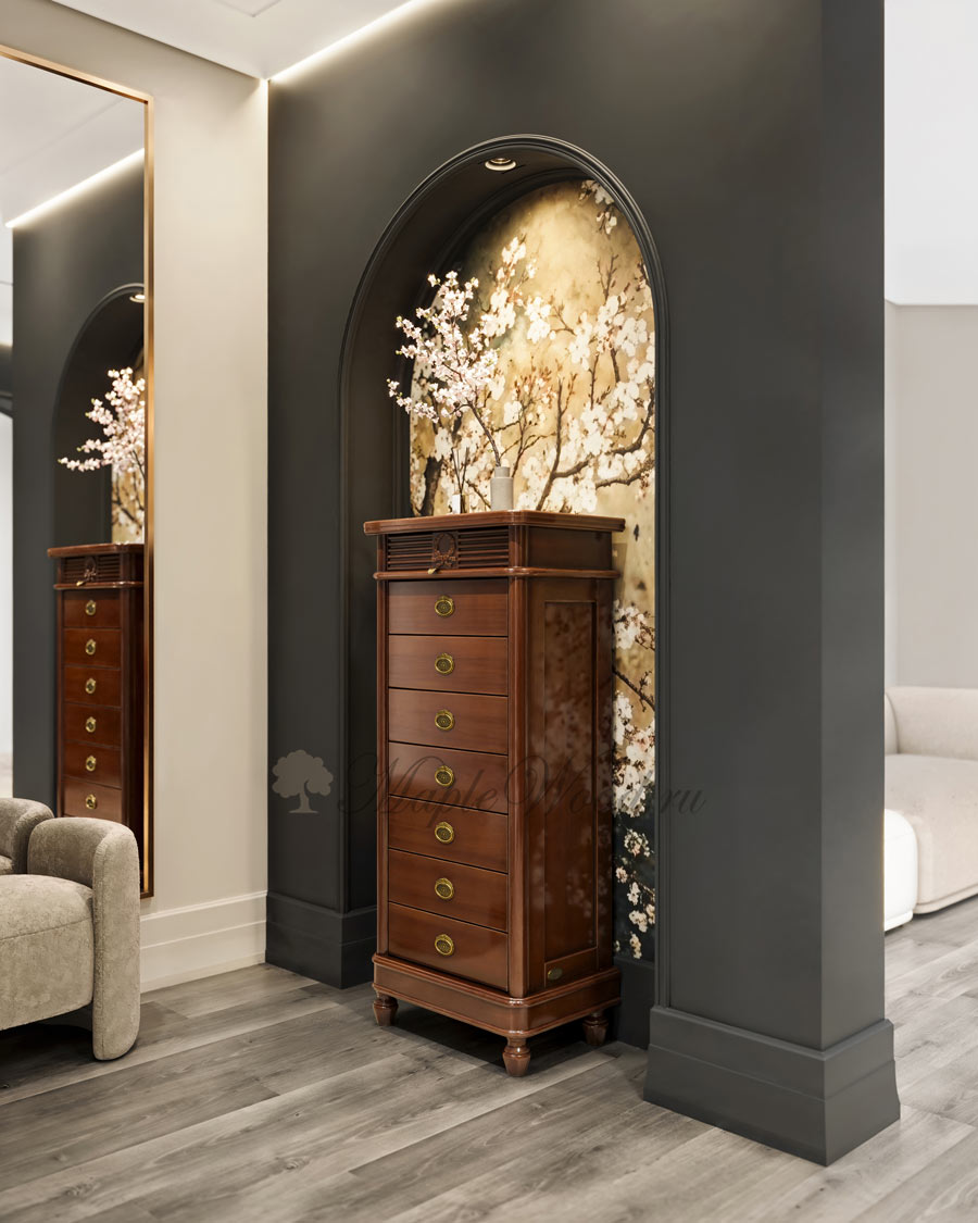 Комод с семью выдвижными ящиками не займет много места в пространстве комнаты, однако позволит организовать удобную систему для хранения белья и одежды.