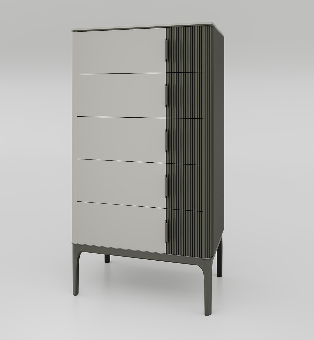 Дизайн комода объединяет минималистичные формы и разнообразные текстуры: гладкий МДФ придаёт современный вид, а фрезеровка добавляет интерес и визуальную привлекательность. Это сочетание фактур создает яркий контраст, который притягивает взгляд и подчеркивает высокое качество изделия.