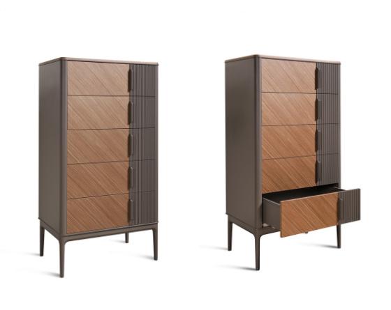 Высокий комод из коллекции Модена от фабрики Тимбер оснащен пятью выдвижными ящиками с механизмом плавного закрывания.
