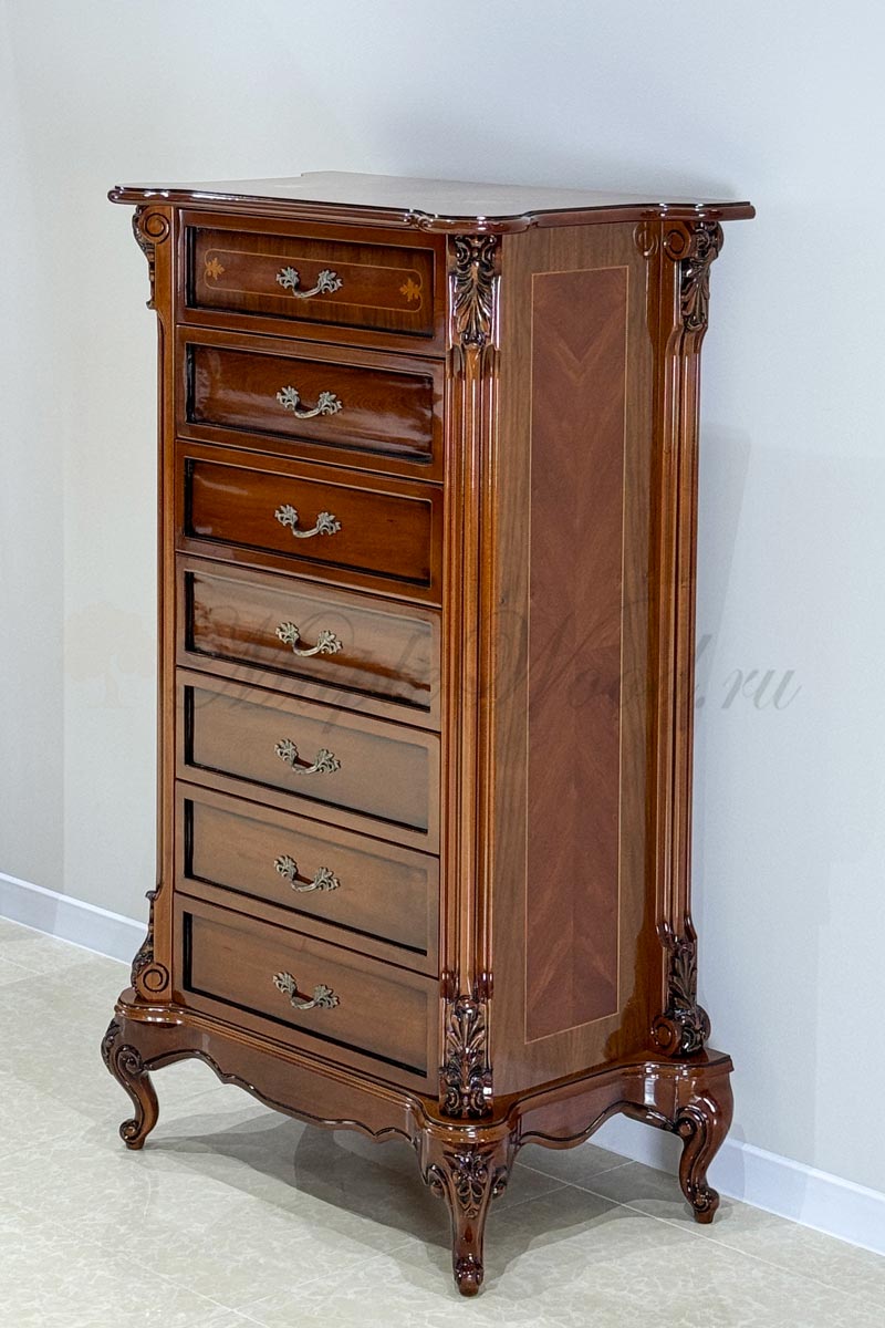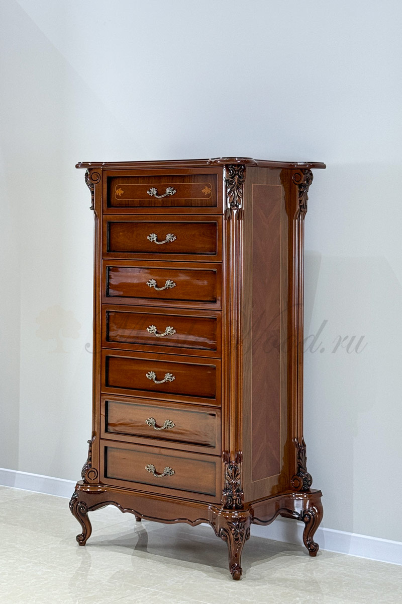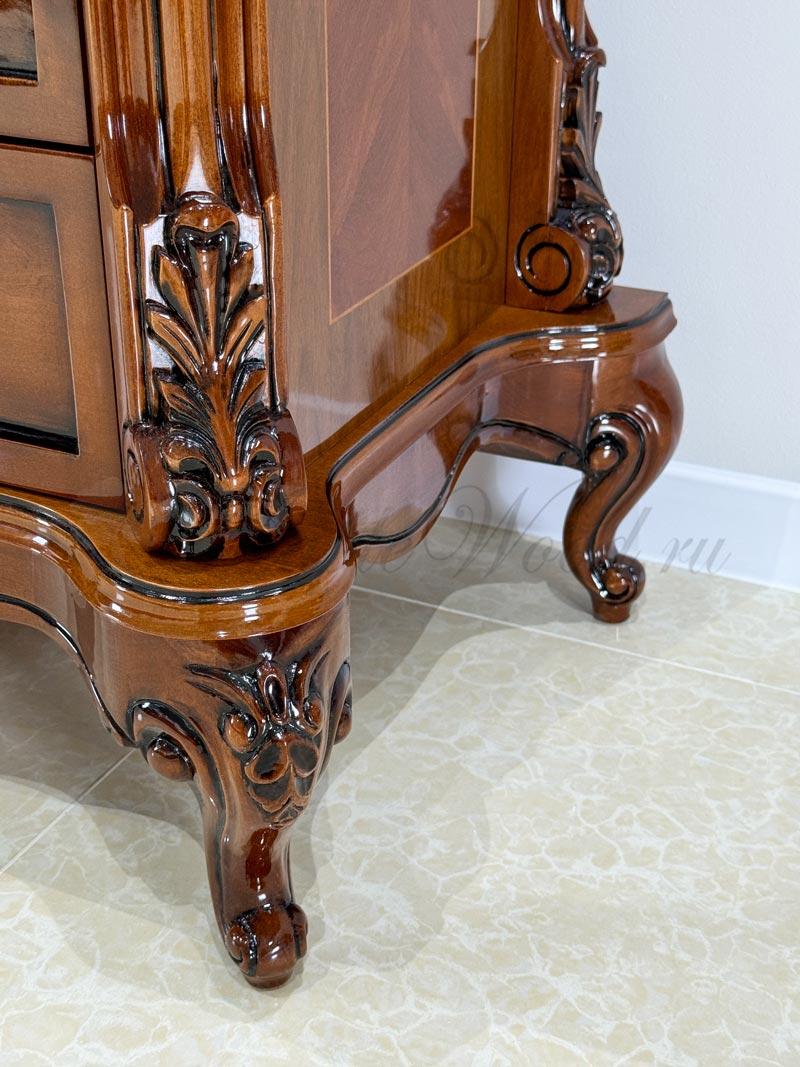 Изделие выполнено в классическом стиле из натурального дерева и декорировано эффектной резьбой и инкрустацией из шпона.