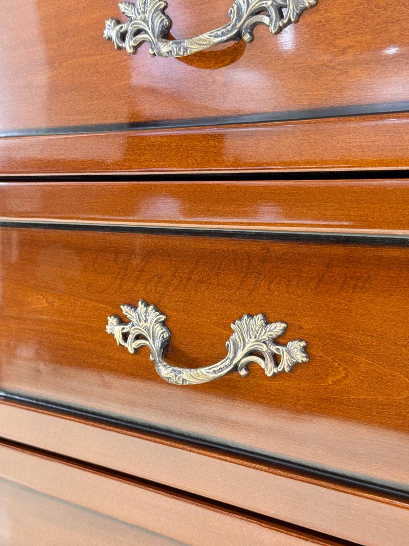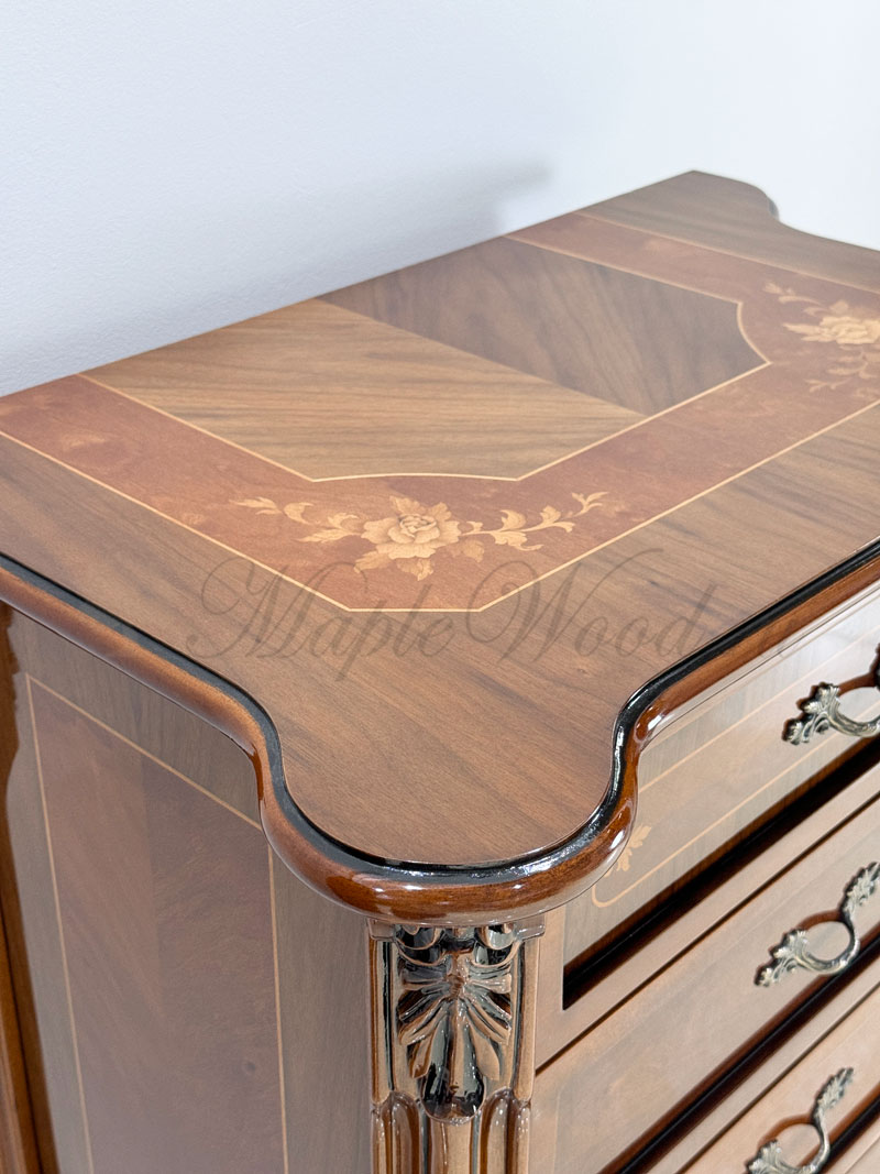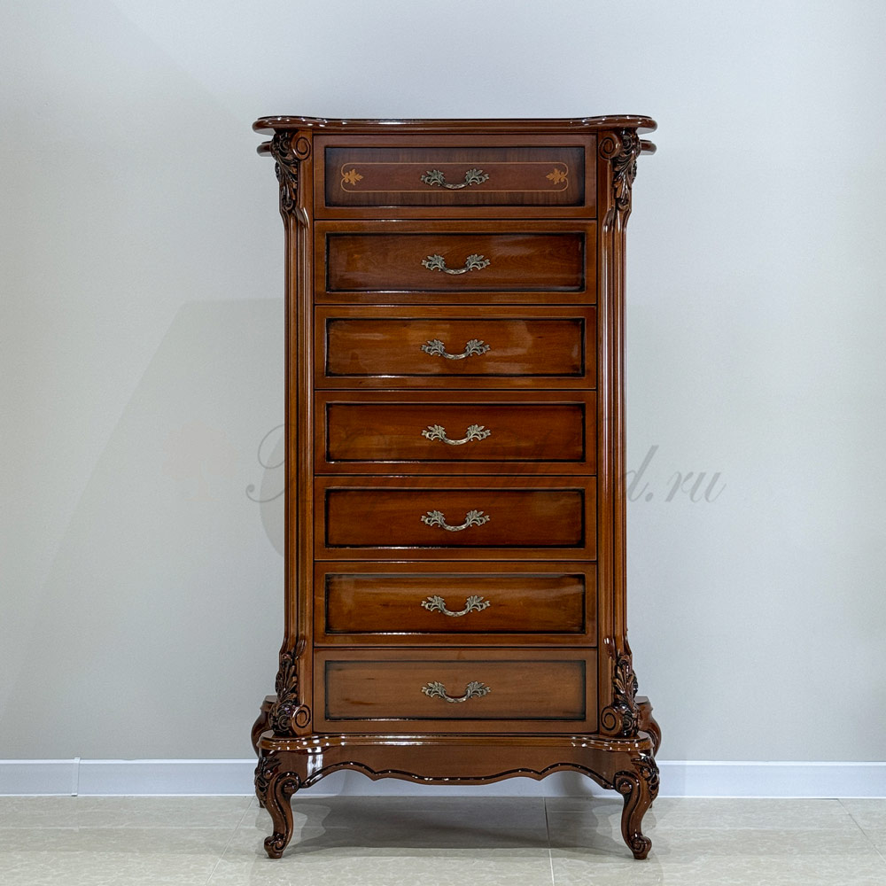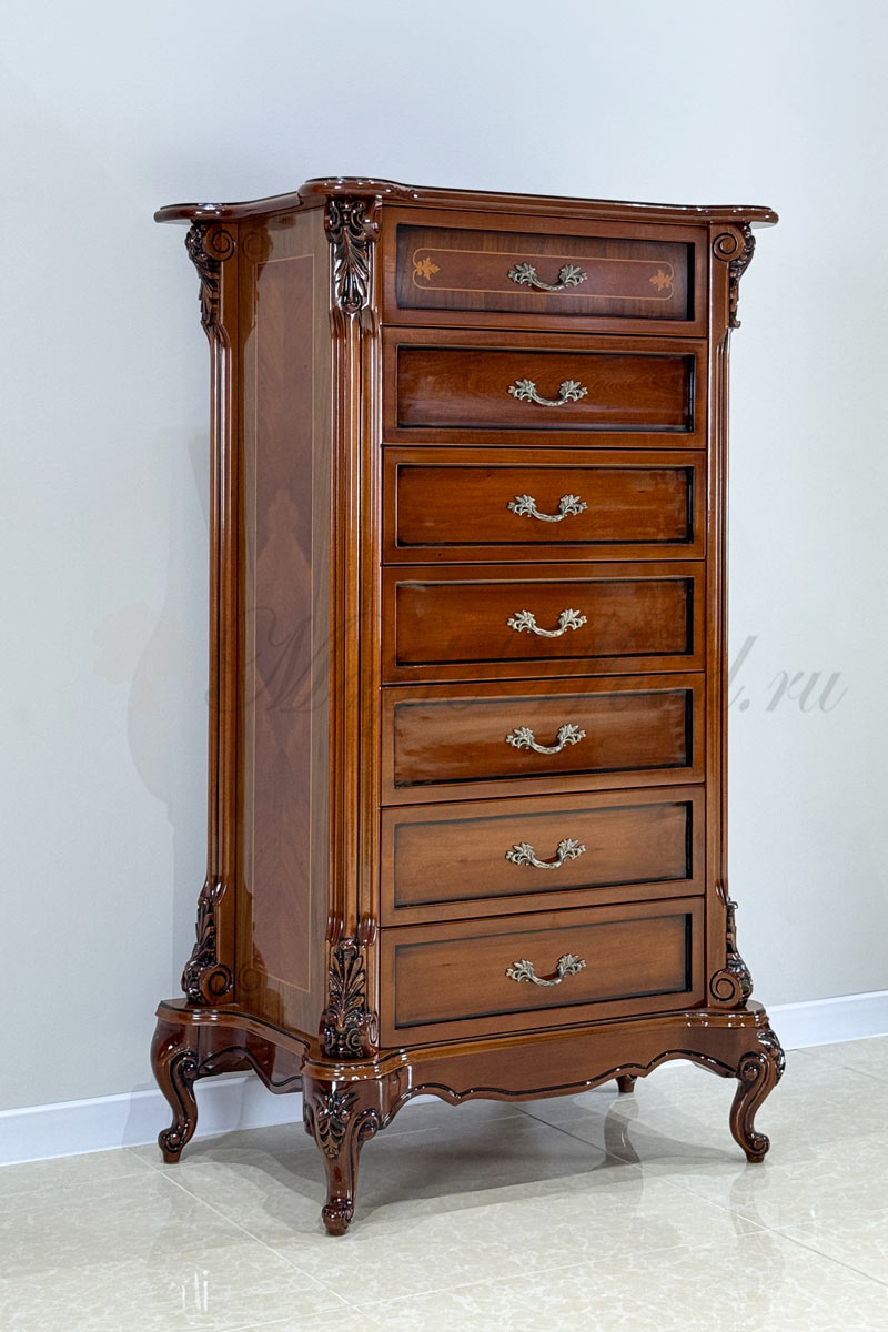 Изделие выполнено в классическом стиле из натурального дерева и декорировано эффектной резьбой и инкрустацией из шпона.