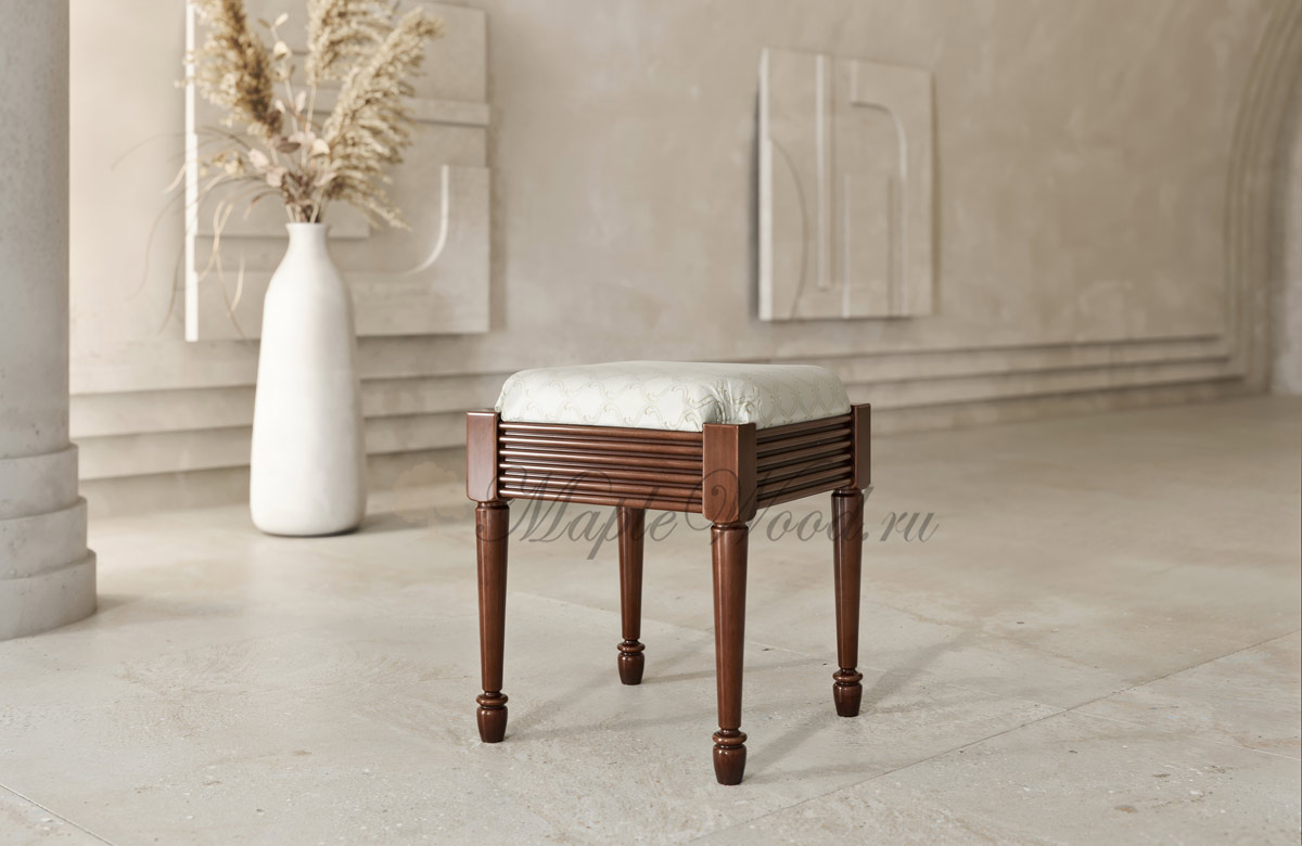 Каркас изделия выполнен из массива дерева с акцентной фрезеровкой, а обивка сиденья на объёмном слое наполнителя предоставляется на выбор из каталога фабрики.
