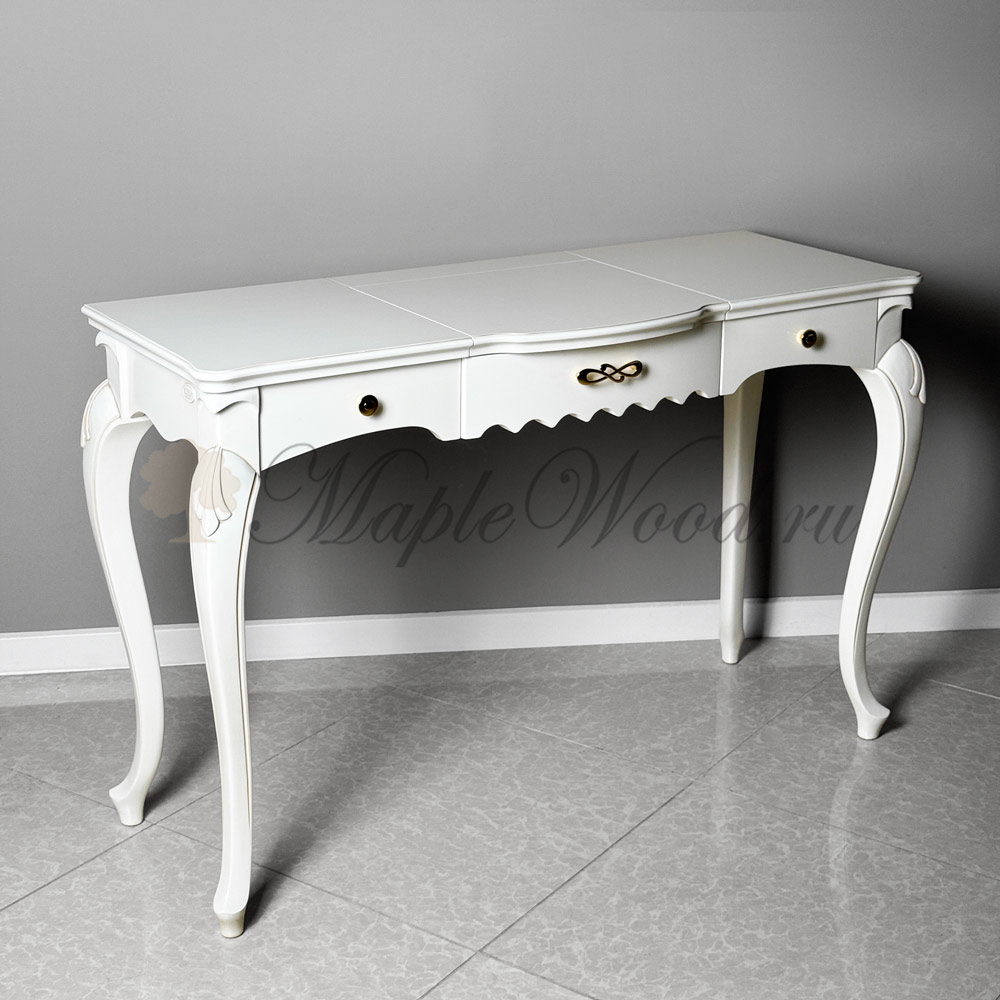 Туалетный стол на фигурных ножках из коллекции Маттео от фабрики Мобекс | Mobex - модель с откидной крышкой-зеркалом и выдвижными ящиками для хранения аксессуаров и украшений.