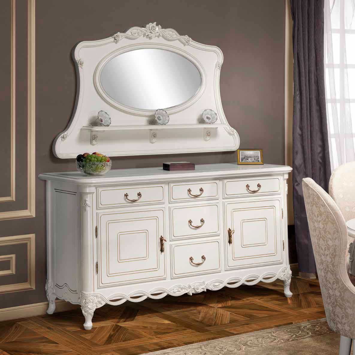 Буфет для гостиной из коллекции Флора от фабрики Simex выполнен в классическом стиле из натурального массива дерева и декорирован золотой патиной и ажурной резьбой с цветочным мотивом.