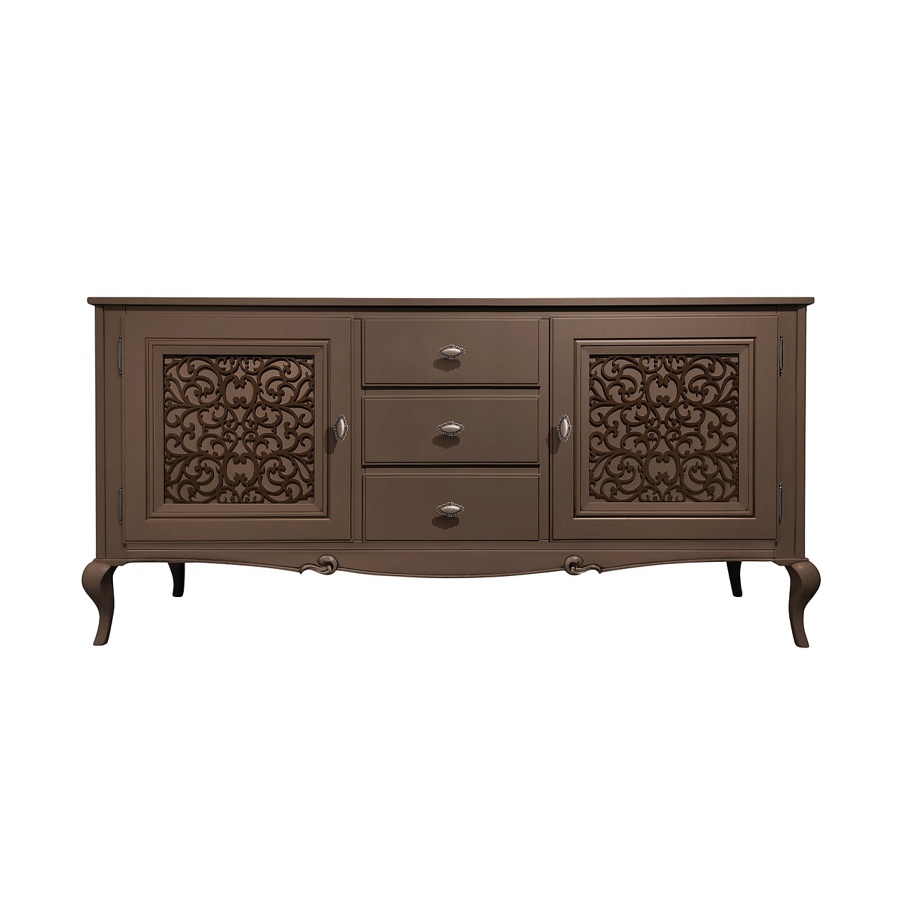 Буфет для гостиной из коллекции Портофино от фабрики Тимбер выполнен из крашенного МДФ в кварцевом оттенке и декорирован контрастной патиной и ажурной вставкой, которая украшает фасады изделия.