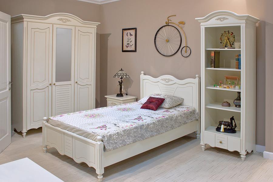 Комплект мебели для комнаты подростка из коллекции Яна от фабрики Simex включает: односпальную кровать, прикроватную тумбу, открытый стеллаж для книг и распашной 3-х дверный шкаф для белья и одежды.
