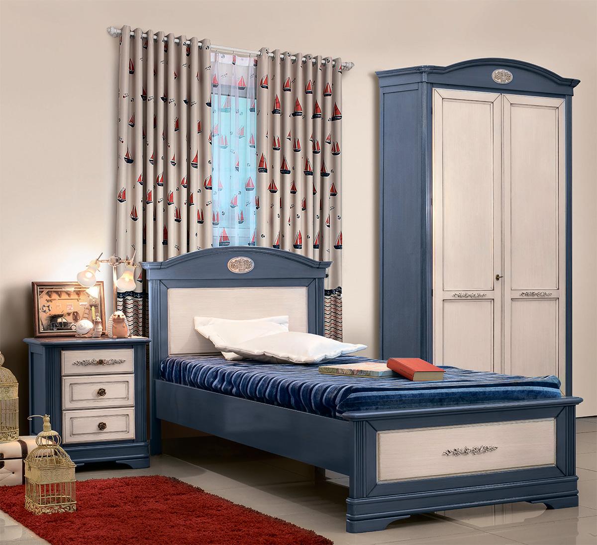 Комплект мебели из коллекции Артемида от фабрики Monte Cristo Mobili включает все необходимые предметы для обустройства детской комнаты: односпальную кровать, тумбу, распашной шкаф для одежды, письменный стол и стеллаж для книг и игрушек.