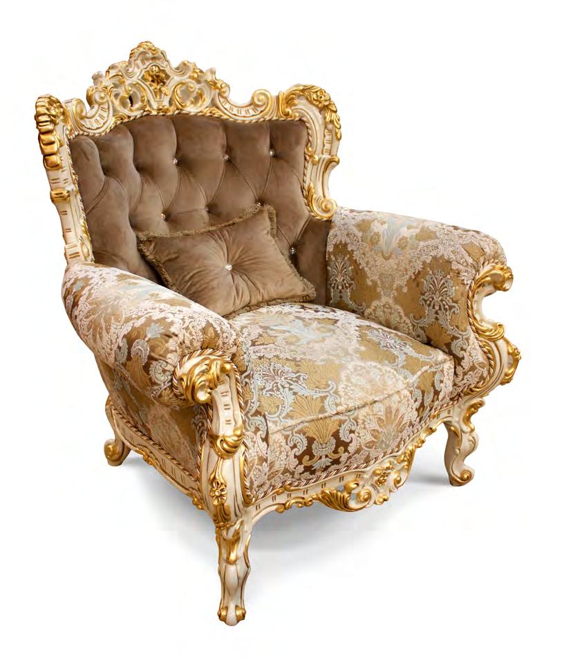 Мягкое кресло из коллекции Клеопатра Люкс от фабрики Simex создано в лучших традициях стиля рококо, сочетая в себе натуральное дерево, гобеленовую ткань с цветочным мотивом и богатую отделку с художественной резьбой и позолотой, которая демонстрирует роскошь изделия в каждой детали.