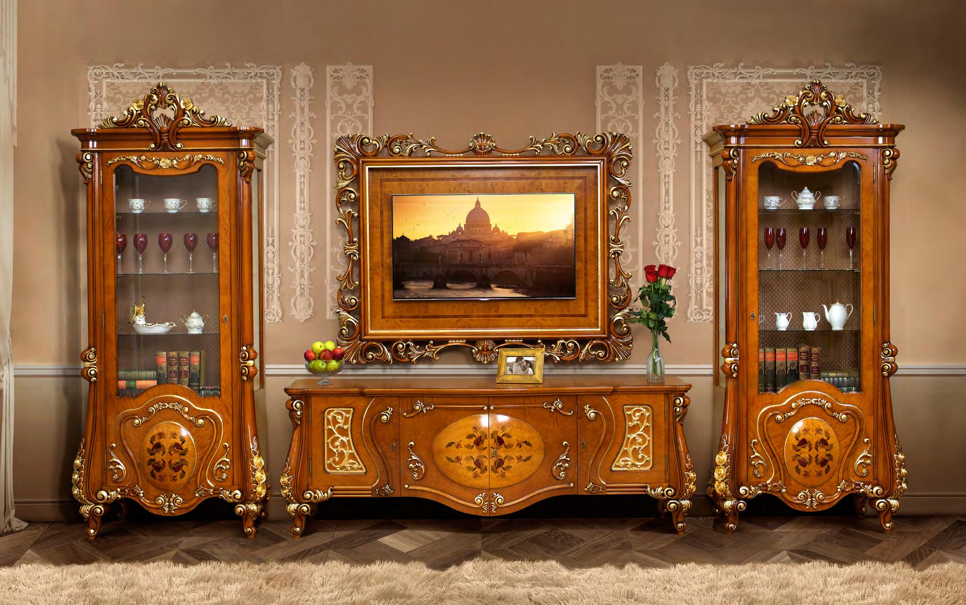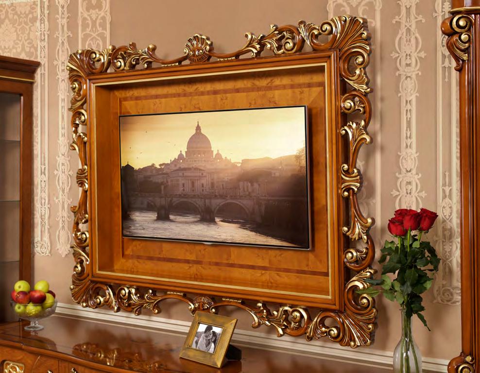 Декоративная рама под ТВ из коллекции Регина от фабрики Simex создана из натурального дерева в лучших традициях стиля рококо, сочетая в себе инкрустацию из шпона и художественную резьбу с золотой патиной, которая придает дополнительный объем и подчеркивает ритмичность узора.