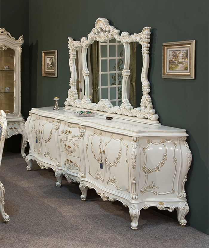 Интерьерное зеркало в оригинальной раме из благородного массива дерева служит дополнением к белому буфету для гостиной из коллекции Клеопатра Люкс от фабрики Simex.