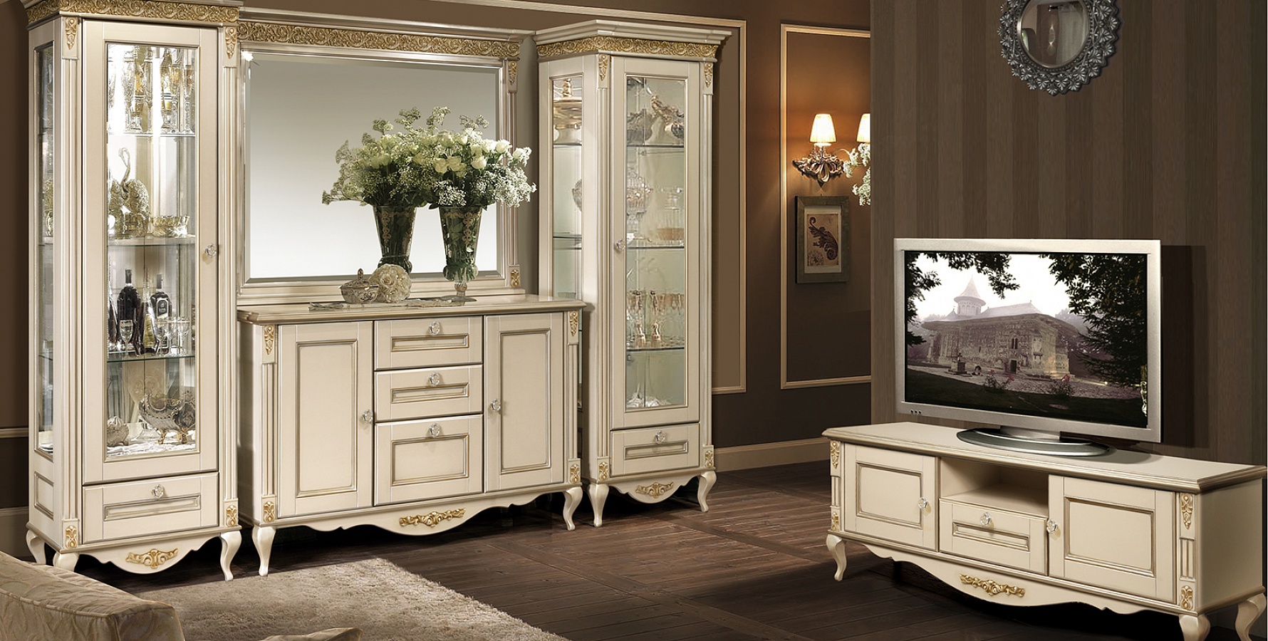 Комплект из коллекции Неаполь от белорусской фабрики Тимбер включает все необходимые предметы для полноценной меблировки гостиной: однодверные витрины, тумбу под ТВ буфет и настенное зеркало в раме, которое визуально увеличит пространство.