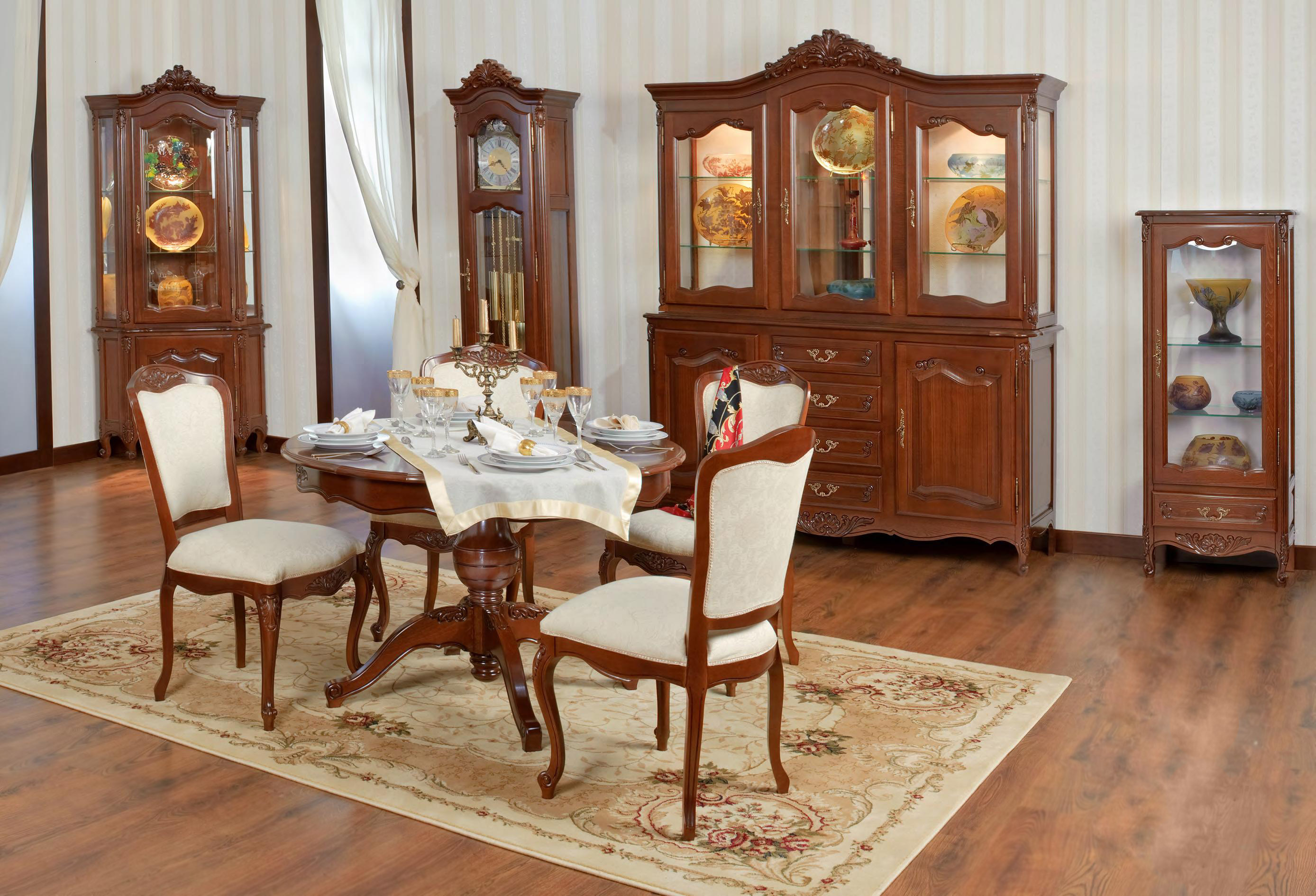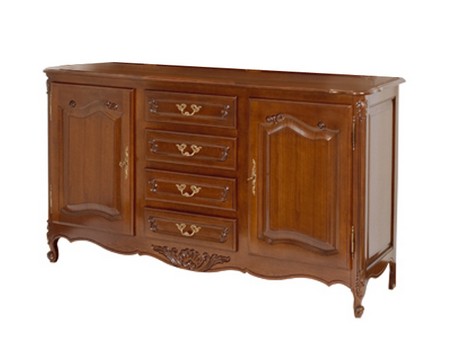 Комод выполнен из массива дерева в отделке орех и декорирован резными элементами, которые подчеркивают классический дизайн изделия.