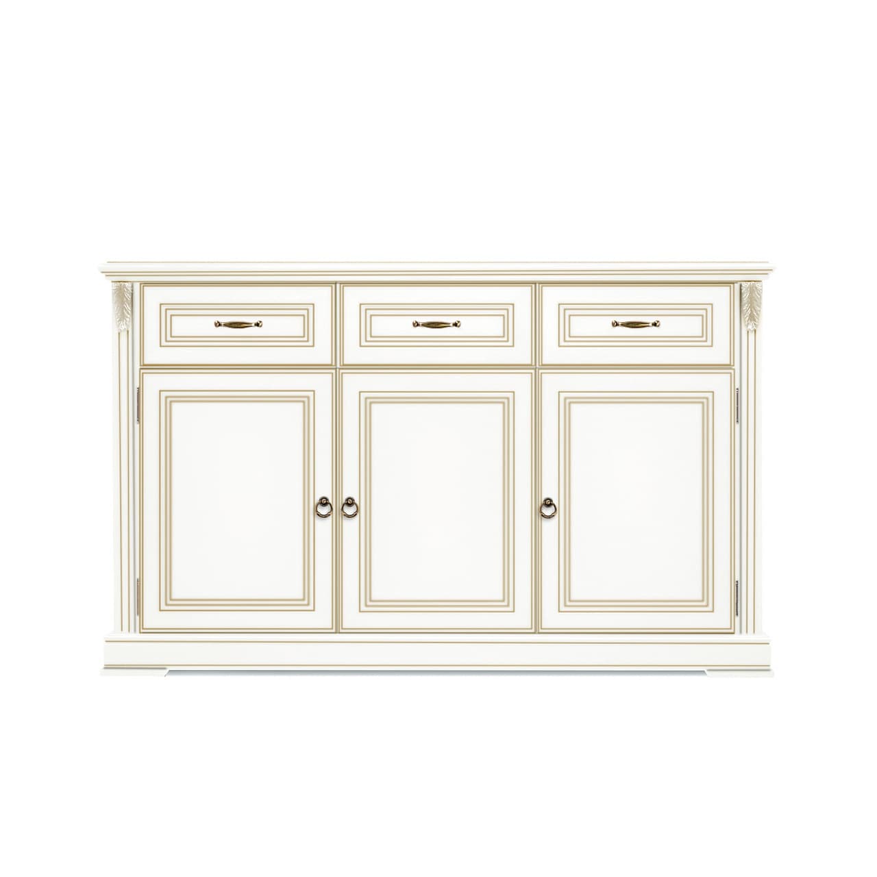 Буфет выполнен в классическом стиле из шпонированного МДФ с элементами из массива дерева и декорирован золотой патиной, которая подчеркивает акцентные элементы изделия.