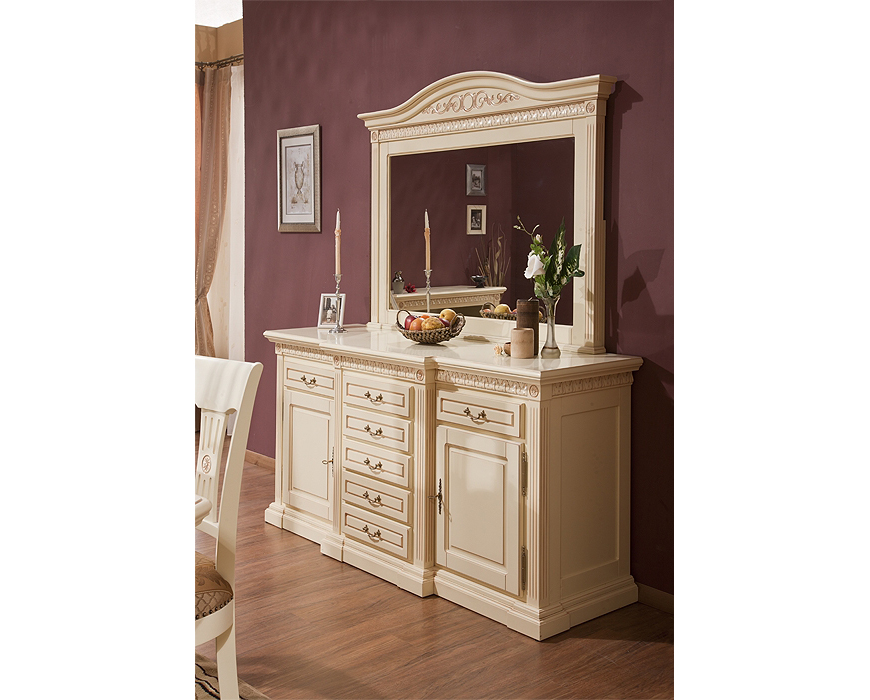 Комплект мебели из 2-х предметов из коллекции Венеция от фабрики Simex включает: буфет и прямоугольное зеркало, образуя единую мебельную композицию для гостиной.