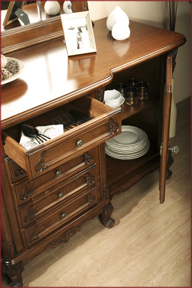 Классический буфет для гостиной и столовой из коллекции Роял от фабрики Simex изготавливается из массива и шпона древесины с использованием высококачественной отделки, которая позволяет изделию долгое время сохранять прочность и красоту.