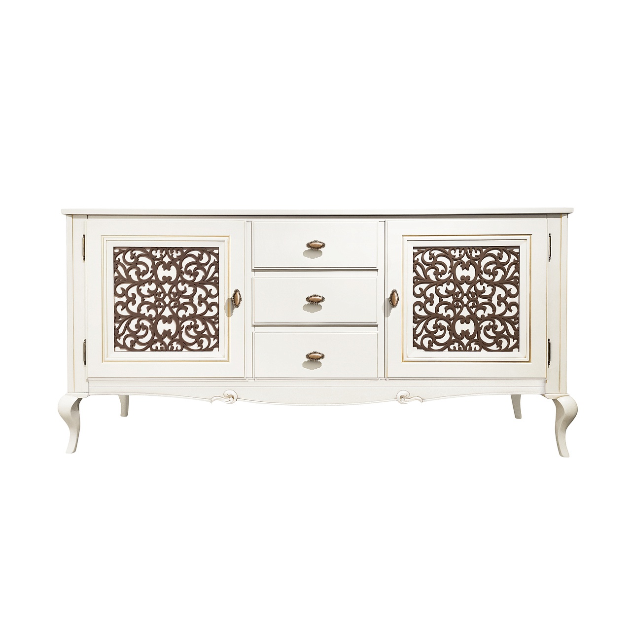 Комод для гостиной из коллекции Портофино от фабрики Тимбер выполнен из крашенного МДФ в светлом оттенке айвори и декорирован контрастной патиной и ажурной вставкой, которая украшает фасады изделия.