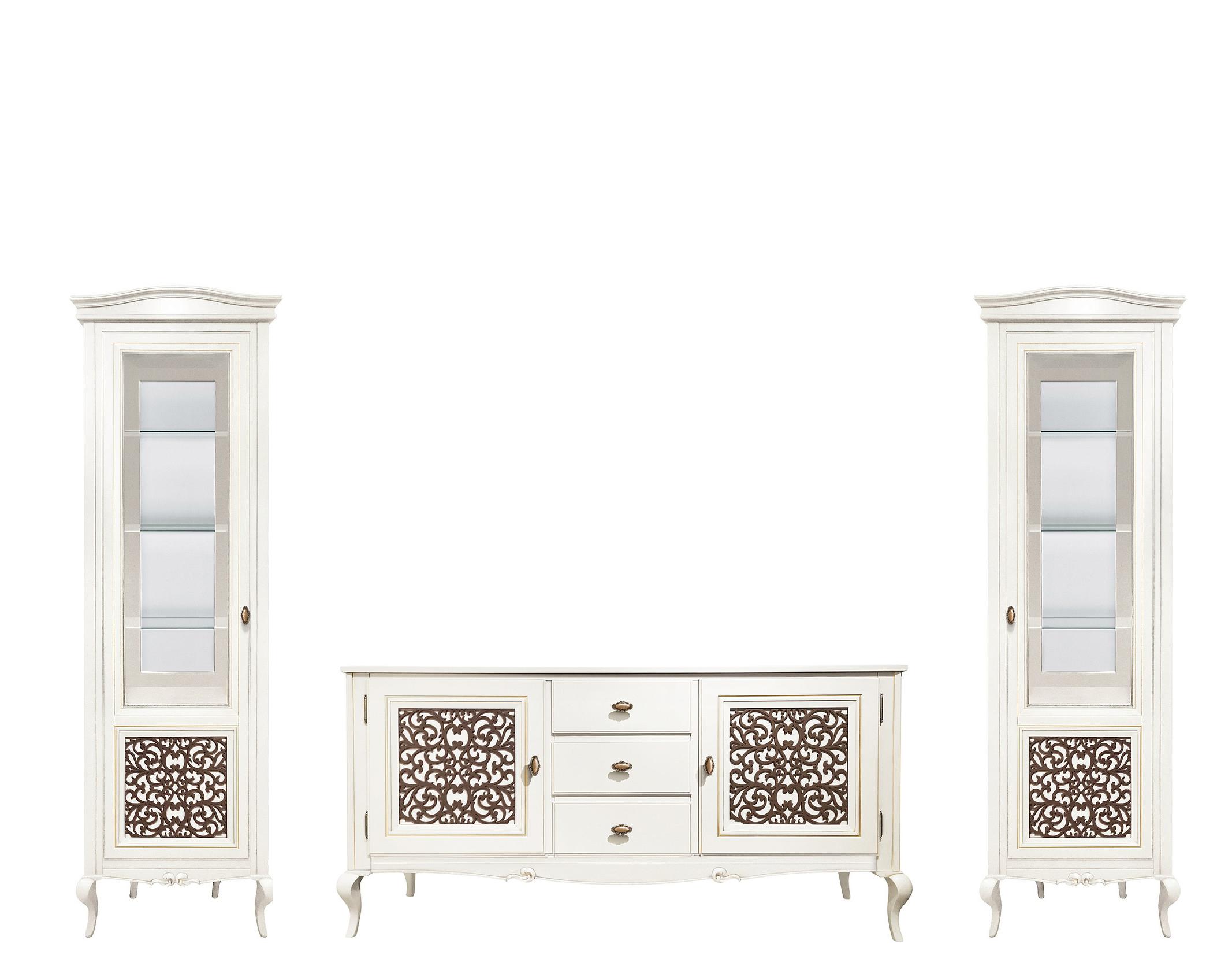Комплект мебели для гостиной из коллекции Портофино от фабрики Тимбер состоит из 3-х предметов и включает: буфет для столового белья и витрины для хранения посуды и различных предметов декора.