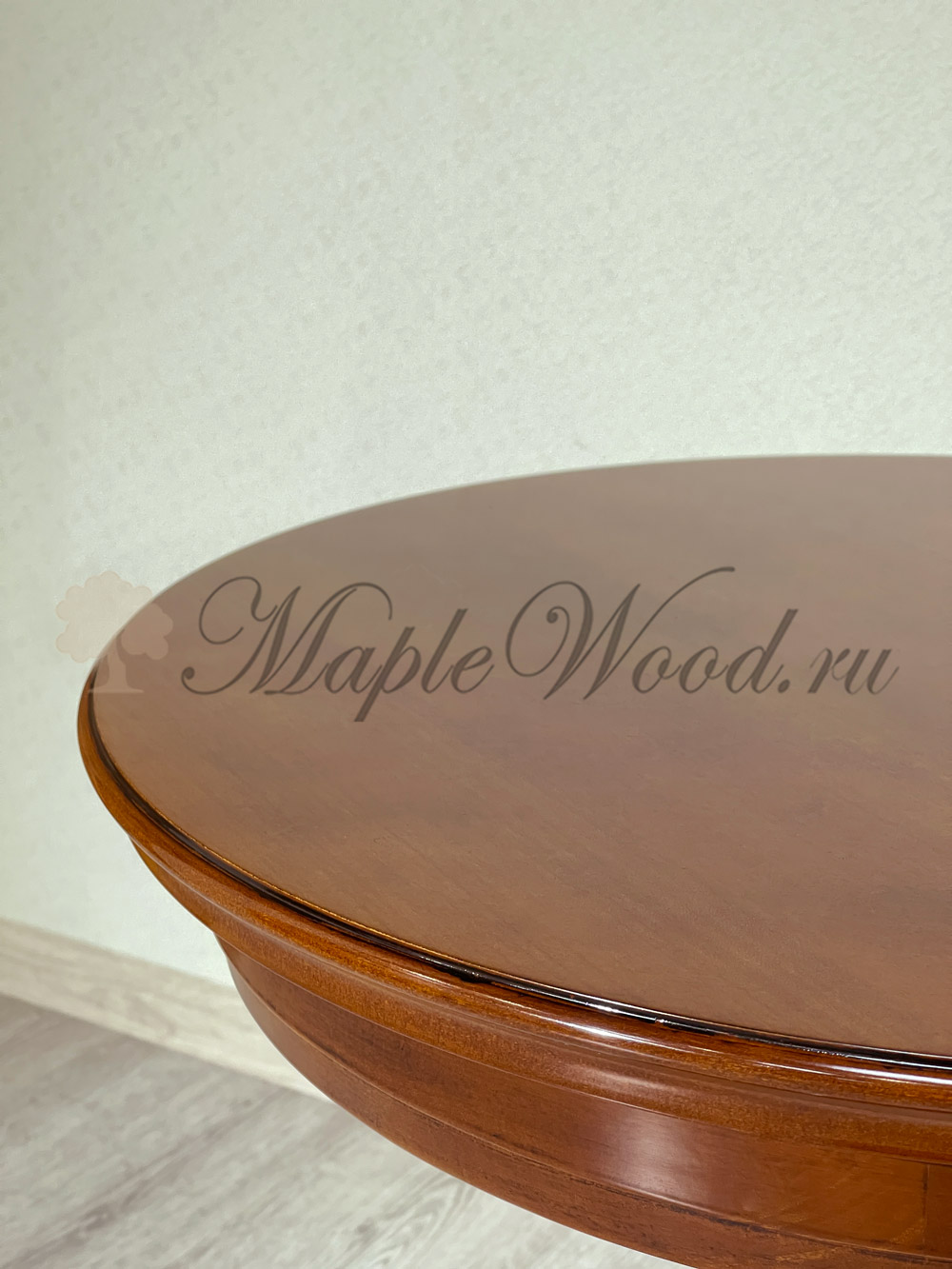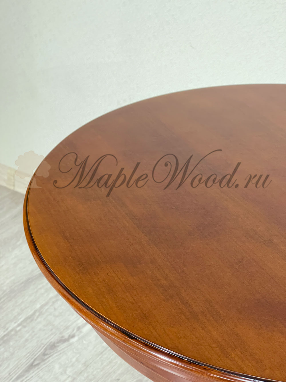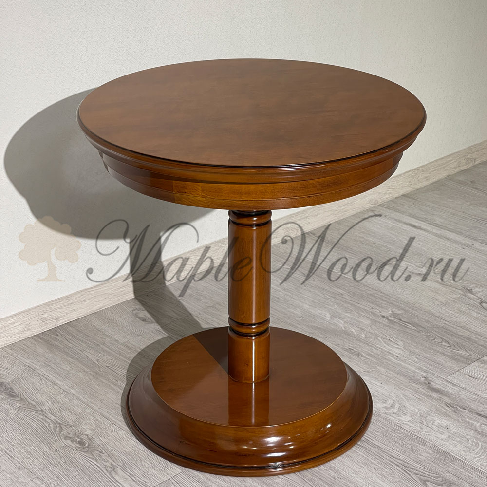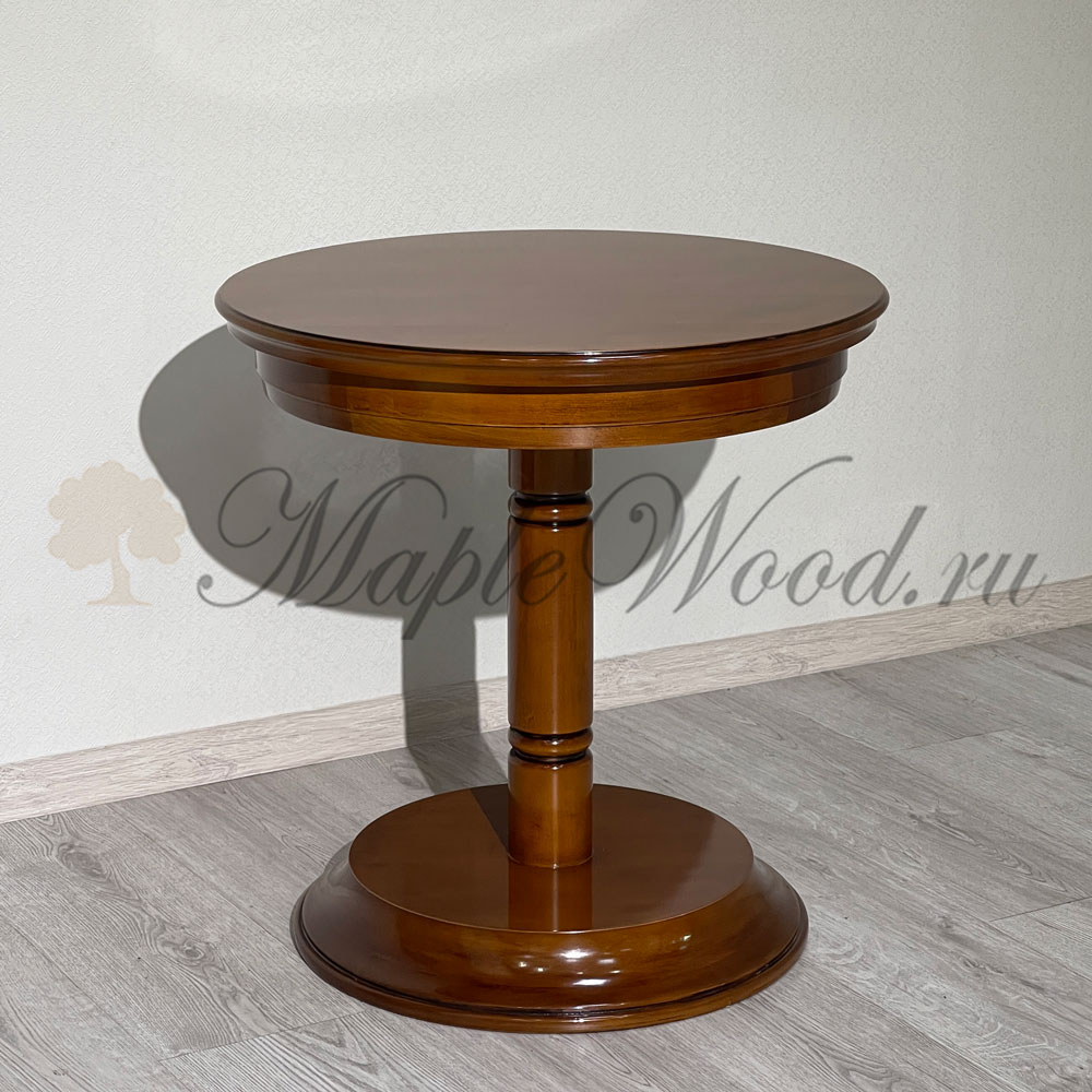Круглый столик выполнен в лаконичном дизайне из натурального массива дерева и может быть исполнен как в темной отделке черешня, так и в светлом оттенке слоновая кость.
