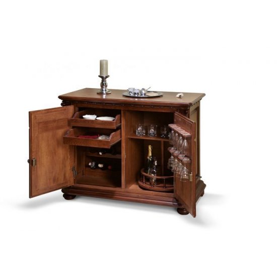 Барный комод выполнен из массива дерева в отделке орех с красным оттенком и украшен резными элементами и декоративными пилястрами, которые подчеркивают классический стиль изделия.