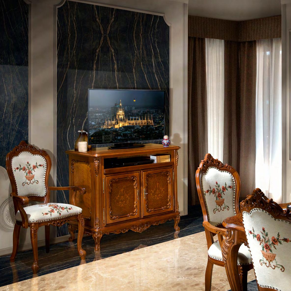 Комод под ТВ из коллекции Клеопатра от мебельной фабрики Simex станет стильным и функциональным дополнением элегантного интерьера гостиной.