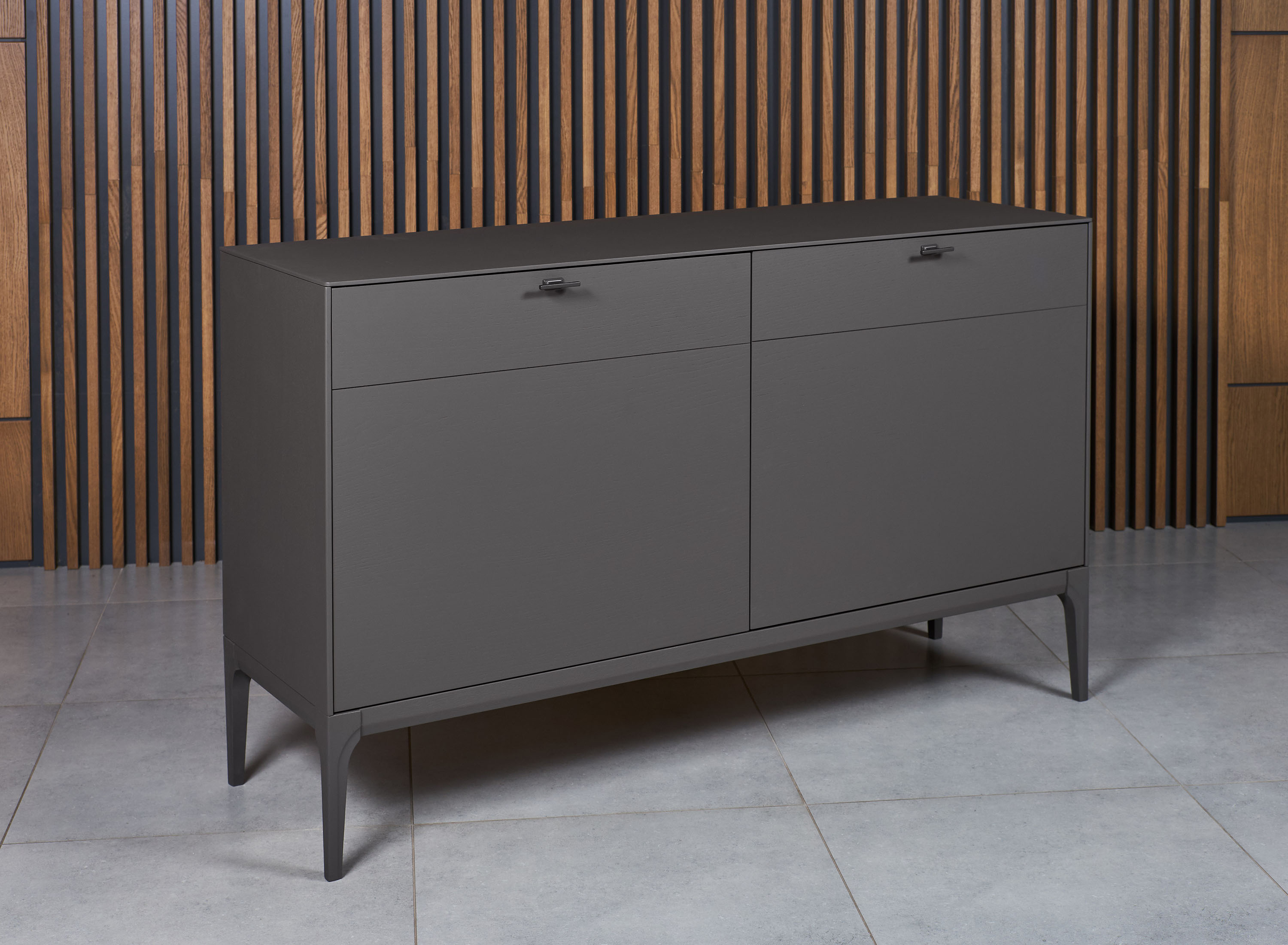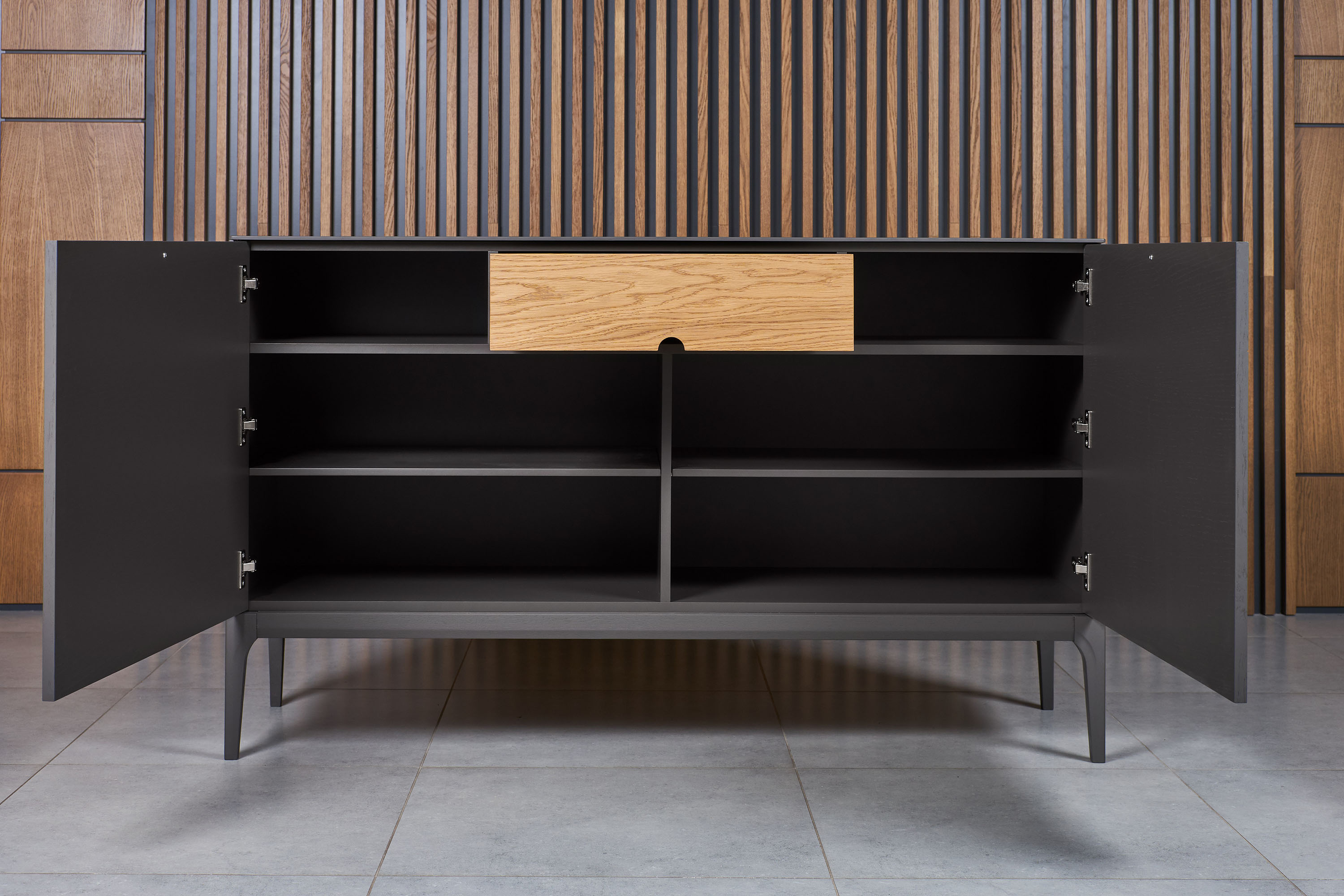 Небольшой 2-х дверный комод для гостиной из коллекции Верона от фабрики Тимбер оборудован полками за распашными дверцами и одним выдвижным ящиком, который имеет контрастную отделку из шпона дуба.