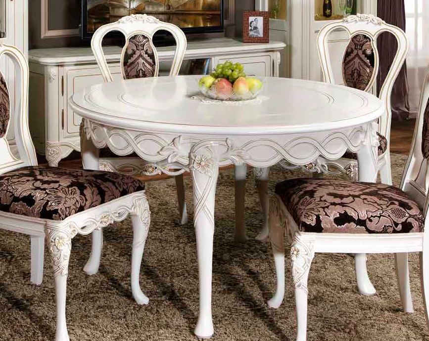 Раздвижной обеденный стол из коллекции Флора от фабрики Simex выполнен в классическом стиле из натурального массива дерева и декорирована золотой патиной и ажурной резьбой с цветочным мотивом.