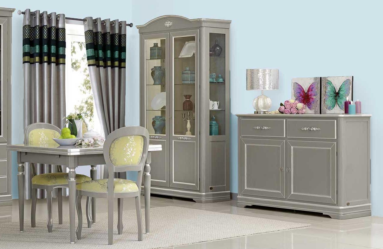 Комплект мебели для гостиной из коллекции Артемида от фабрики Monte Cristo Mobili состоит из 5-ти предметов и включает: обеденную группу, 2-х дверную витрину для посуды и небольшой комод, который можно использовать, как тумбу под телевизор.