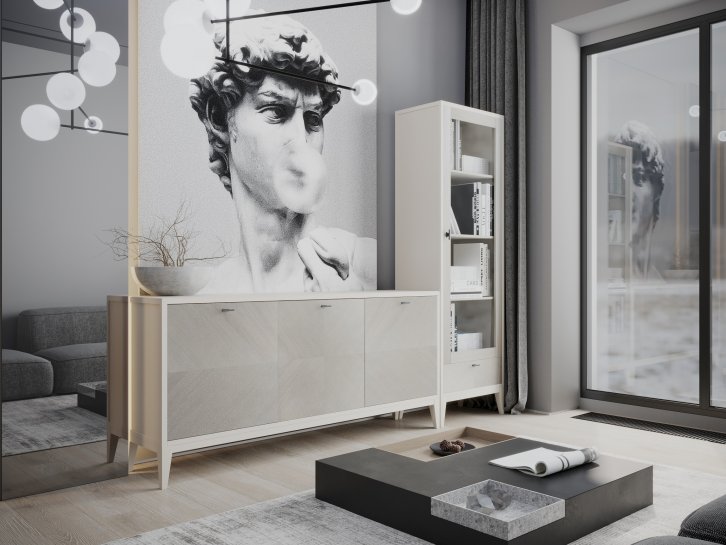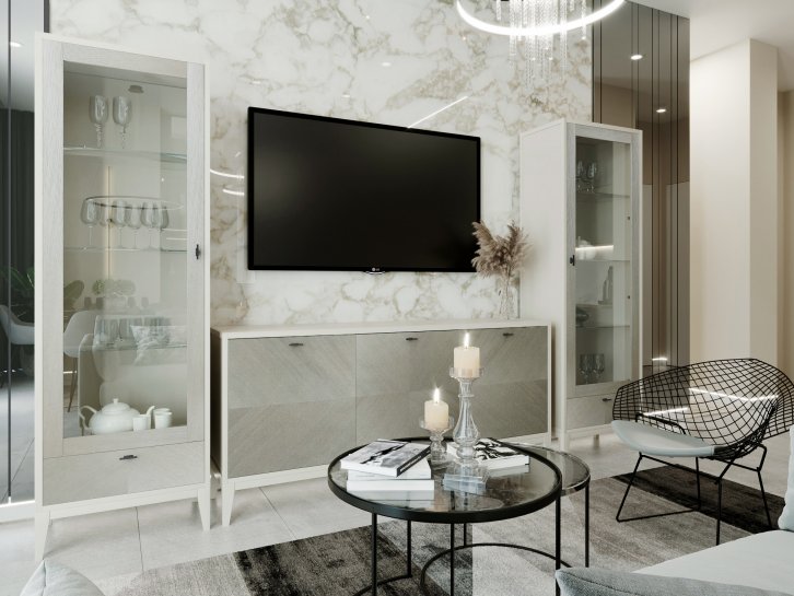 Мебель выполнена в современном дизайне из крашенного МДФ и декорирована фактурным шпоном.