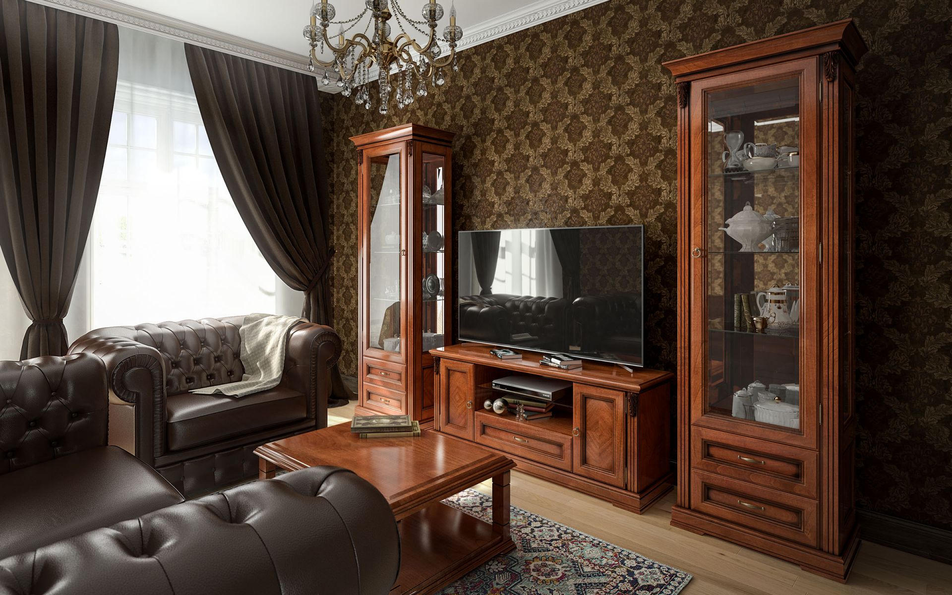 Комплект мебели из коллекции Палермо от фабрики Тимбер включает: однодверные витрины и ТВ тумбу, образуя единую и гармоничную композицию для элегантного интерьера гостиной.