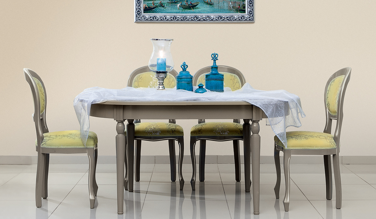 Комплект мебели из 5-ти предметов из коллекции Артемида от фабрики Monte Cristo Mobili включает: раздвижной стол и четыре мягких стула, образуя единую и гармоничную обеденную группу для гостиной, столовой и кухни.
