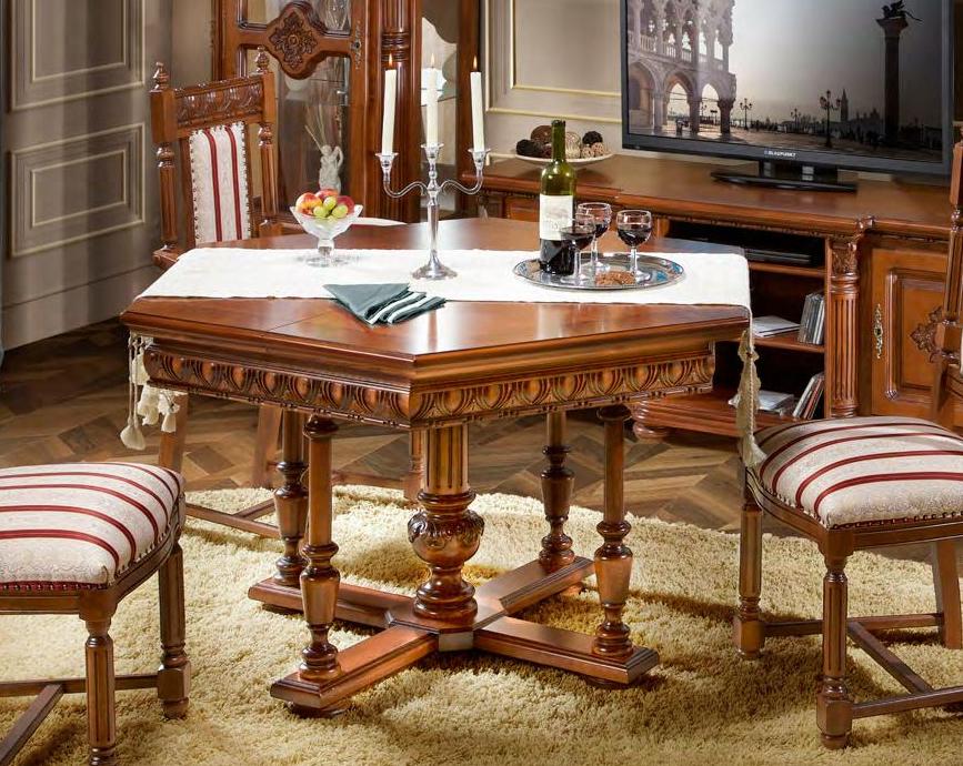 Раскладной обеденный стол из коллекции Венеция Люкс от фабрики Simex очаровывает своей оригинальной шестиугольной формой и эффектной отделкой ручной работы.