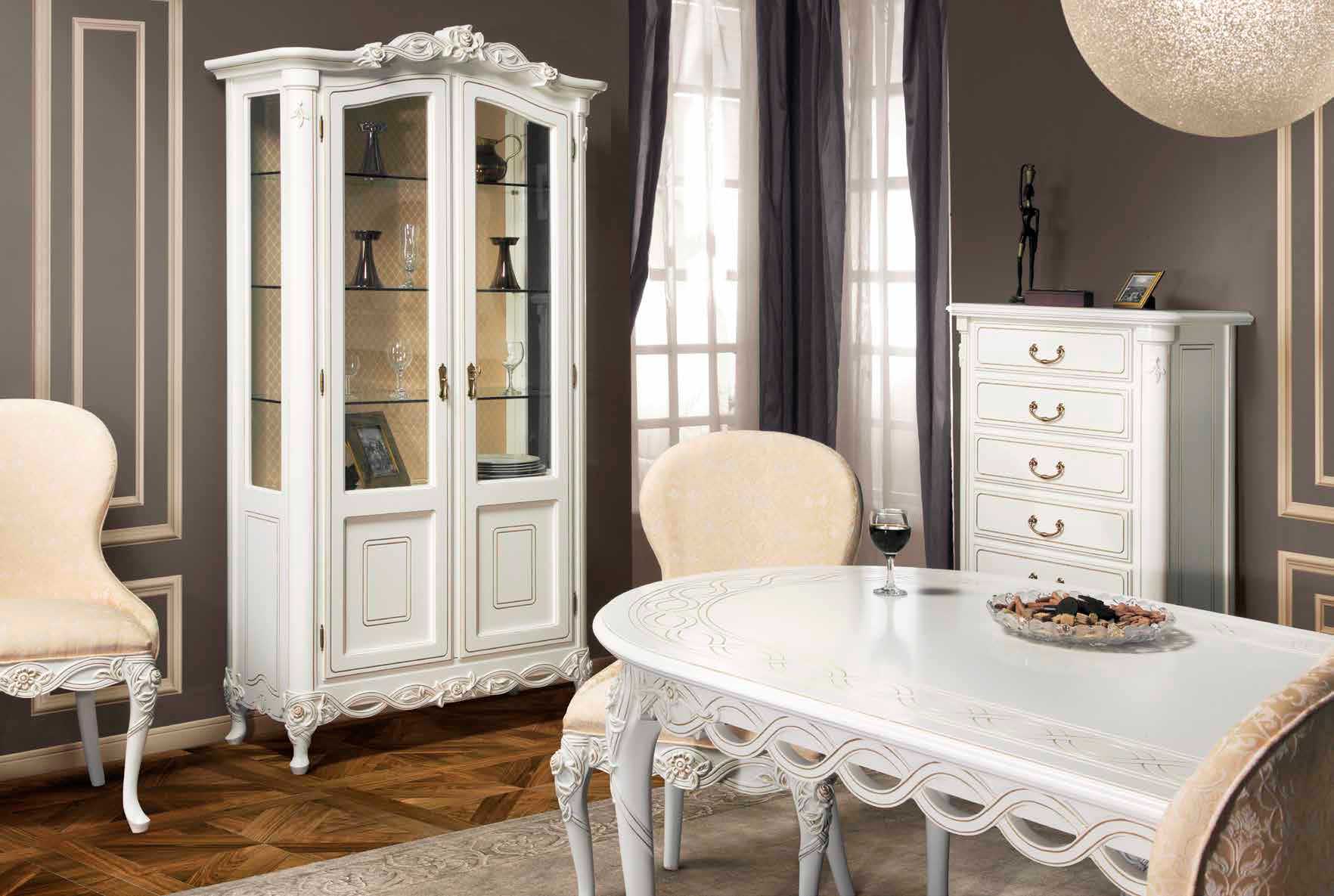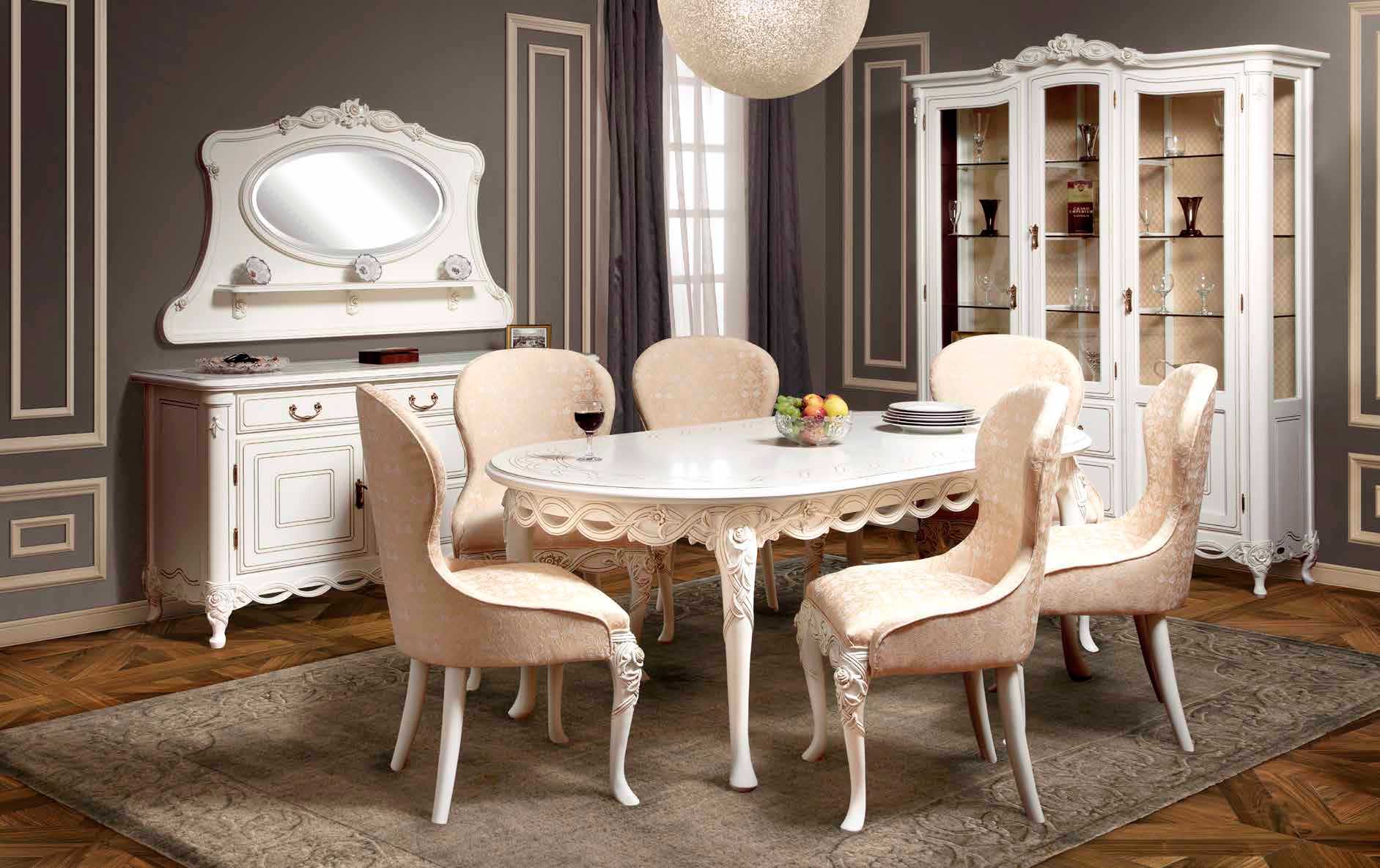 Раздвижной обеденный стол из коллекции Флора от фабрики Simex выполнен в классическом стиле из натурального массива дерева и декорирована золотой патиной и ажурной резьбой с цветочным мотивом.