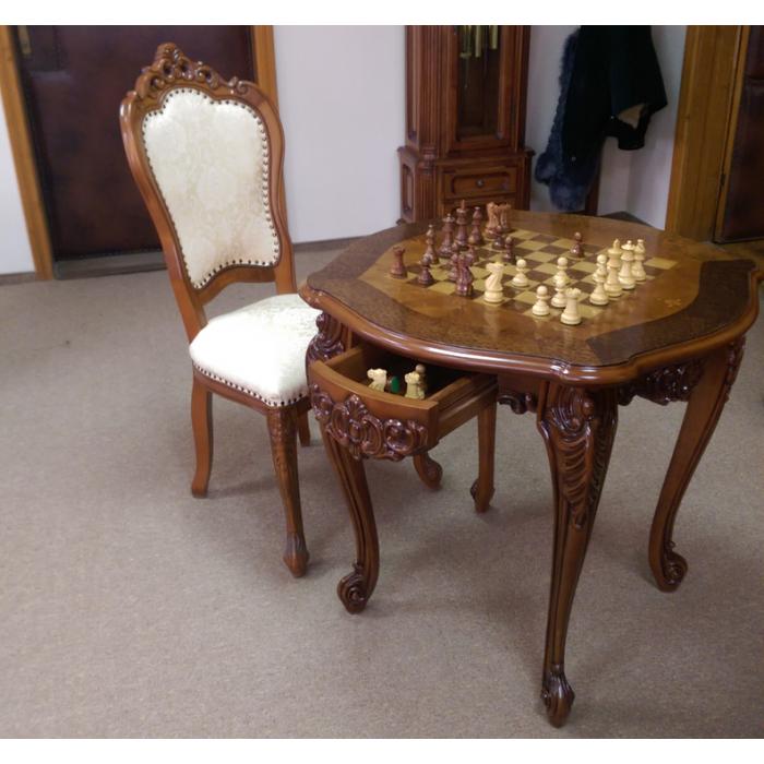 Столик выполнен по всем канонам классического стиля из натурального дерева и декорирован резьбой ручной работы и инкрустацией, которая подчеркивает эффектный внешний вид изделия.