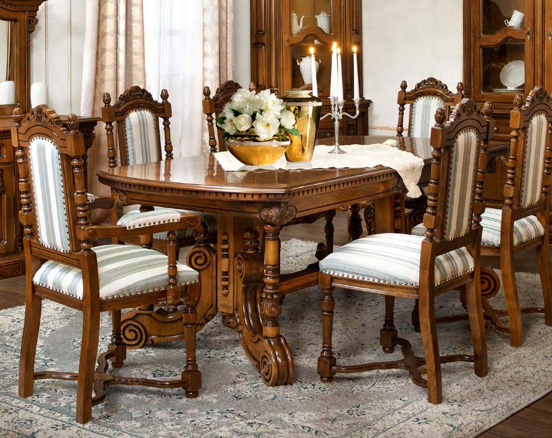 Обеденный стол из коллекции Кристина от фабрики Simex создан в лучших традициях классического стиля, сочетая натуральный массив дерева и богатую отделку ручной работы, которая демонстрирует роскошь изделия в каждой детали.